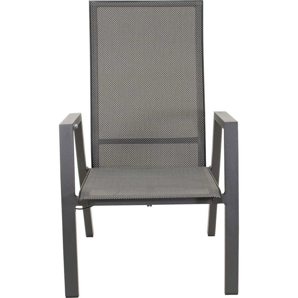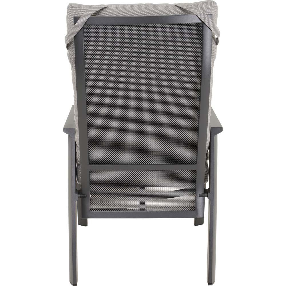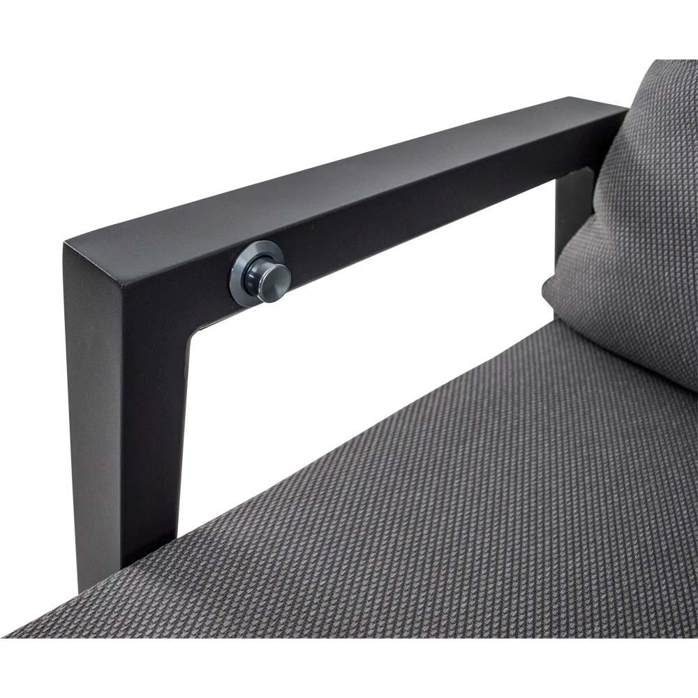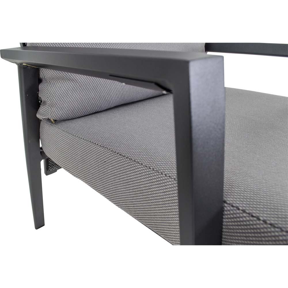 Dieses Sitzmöbel verfügt über einen stabilen Aluminiumrahmen in matt anthraziter Ausführung. Sitz- und Rückenfläche sind mit einem Textilene-Bezug in Schwarz und Grau ausgestattet, der für eine formstabile und pflegeleichte Nutzung ausgelegt ist. Ergänzt wird die Konstruktion durch ein Olefin-Kissen mit einem Flächengewicht von 270 g/m².