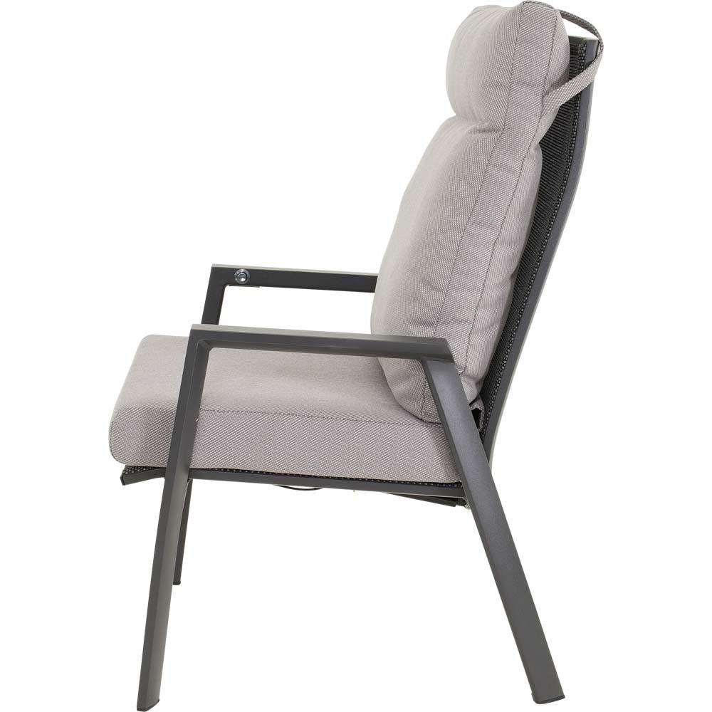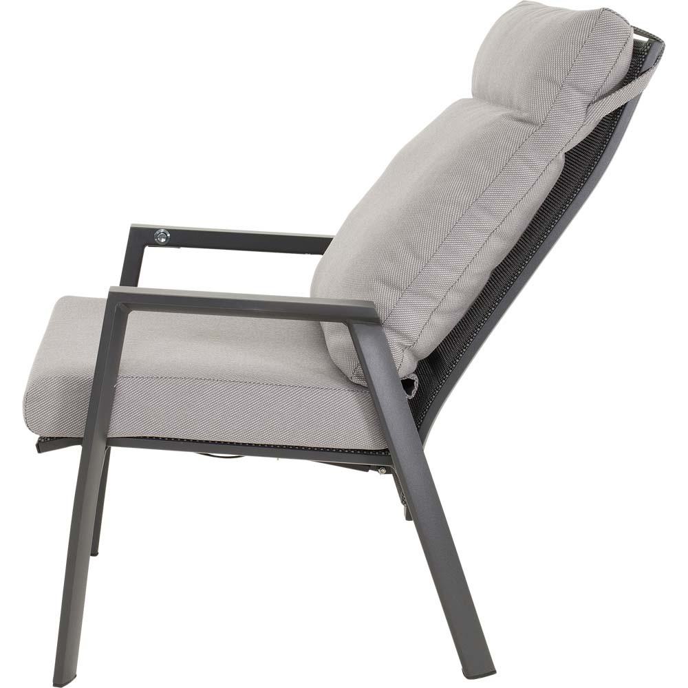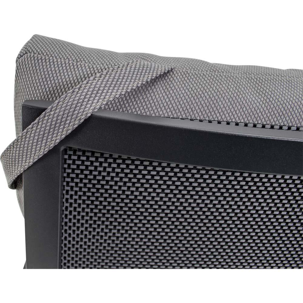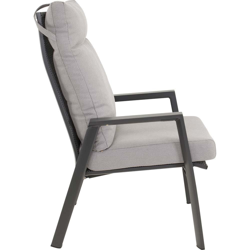 Dieses Sitzmöbel verfügt über einen stabilen Aluminiumrahmen in matt anthraziter Ausführung. Sitz- und Rückenfläche sind mit einem Textilene-Bezug in Schwarz und Grau ausgestattet, der für eine formstabile und pflegeleichte Nutzung ausgelegt ist. Ergänzt wird die Konstruktion durch ein Olefin-Kissen mit einem Flächengewicht von 270 g/m².