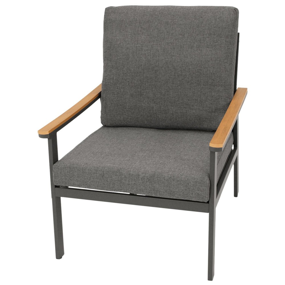 Die langen Sommernächte können mit diesem modernen Lounge-Set auf jeden Fall kommen. Es besteht aus einem Sofa, zwei Sesseln und Polstern. Tisch- und Sofagestelle sind aus Aluminium mit Holzoptik. Die Rücken- und Sitzkissen haben Bezüge aus Polyester in Grau. Perfekt für schöne Abende mit Freunden und Familie.