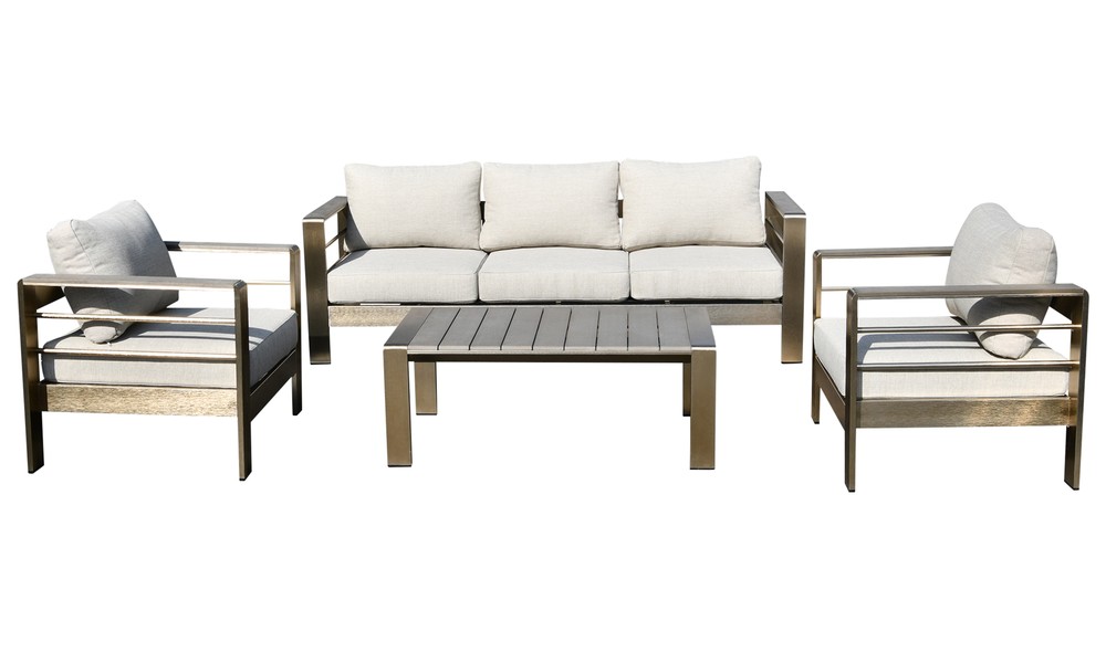 Dieses hochwertige 4-teilige Loungeset vereint modernes Design, erstklassigen Komfort und langlebige Materialien – perfekt für stilvolle Stunden im Garten, auf der Terrasse oder dem Balkon. Das Set besteht aus einem großzügigen 3-Sitzer-Sofa, zwei komfortablen Sesseln, einem passenden Tisch sowie insgesamt 10 Sitz- und Rückenkissen, die für ein besonders angenehmes Sitzerlebnis sorgen. Die stabilen Gestelle aller Elemente sind aus Aluminium gefertigt und mit einem edlen, dunkelgrauen Finish versehen. Die gebürstete Oberfläche verleiht dem Set eine moderne, hochwertige Optik und macht es gleichzeitig besonders widerstandsfähig gegenüber Witterungseinflüssen. So eignet sich das Loungeset ideal für den langfristigen Einsatz im Außenbereich. Ein besonderes Designmerkmal sind die Armlehnen, die mit dunkelgrauem Holz ausgestattet sind. Diese Details sorgen für eine warme, natürliche Anmutung und setzen stilvolle Akzente im Gesamtbild. Auch die Tischplatte greift dieses Gestaltungselement auf: Sie ist mit Leisten in passender Optik versehen und rundet das harmonische Erscheinungsbild perfekt ab. Die bequemen Sitz- und Rückenkissen aus strapazierfähigem Polypropylen in zeitlosem Grau bieten optimalen Komfort und sind zugleich pflegeleicht sowie robust. Sie laden zum Verweilen ein – ob bei entspannten Nachmittagen, geselligen Abenden oder gemütlichen Stunden mit Familie und Freunden. Dieses Loungeset überzeugt durch seine gelungene Kombination aus Funktionalität, Komfort und modernem Design und verwandelt Ihren Außenbereich in eine stilvolle Wohlfühloase.