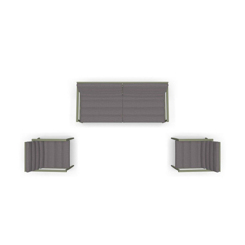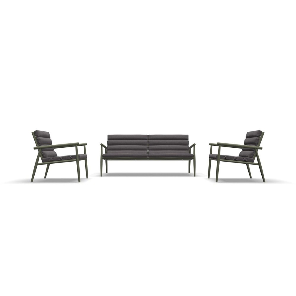 Verwandle deine Terrasse oder deinen Garten in eine stilvolle Ruheoase mit diesem exklusiven Loungeset, bestehend aus zwei Sesseln und einer großzügigen Loungebank. Das robuste Gestell aus hochwertigem Aluminium überzeugt mit einem edlen grünen Finish, das dem Set eine moderne, natürliche Eleganz verleiht und sich harmonisch in jede Außenumgebung einfügt. Die Armlehnen sind formschön gestaltet und bieten zusammen mit der stabilen Konstruktion höchsten Komfort und langlebige Qualität. Für ein besonders angenehmes Sitzgefühl sorgen die Sitz- und Rückenkissen aus strapazierfähigem Olefin in warmem Beige. Dieses Material ist nicht nur wetterbeständig und UV-resistent, sondern fühlt sich auch angenehm weich an – perfekt für lange, entspannte Stunden im Freien. Die farbliche Kombination aus sattem Grün und dezentem Beige schafft ein zeitloses, stilvolles Gesamtbild. Die Loungebank bietet mit ihren Maßen von ca. 76 x 72 x 168 cm (Breite x Höhe x Tiefe) großzügig Platz, um gemeinsam zu entspannen. Die beiden Sessel ergänzen das Ensemble ideal und messen jeweils ca. 76 x 76 x 60 cm, was ihnen eine kompakte, zugleich sehr komfortable Größe verleiht. Dieses Loungeset verbindet Design, Komfort und Funktionalität – perfekt für alle, die ihren Außenbereich aufwerten und eine einladende Atmosphäre schaffen möchten. Ob für gemütliche Abende zu zweit, entspannte Stunden mit Freunden oder einfach nur zum Abschalten: Dieses Set wird schnell zum Lieblingsplatz im Freien.