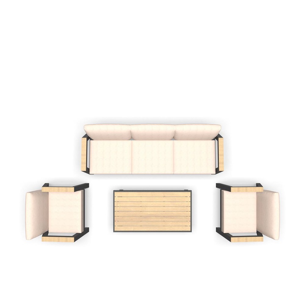 Dieses elegante Loungeset vereint stilvolles Design, hochwertige Materialien und maximalen Sitzkomfort und verwandelt Terrasse, Balkon oder Wohnbereich in eine gemütliche Lounge-Oase. Das Set besteht aus einer Loungebank, zwei Sesseln und einem Couchtisch und bietet sowohl komfortable Sitzgelegenheiten als auch praktische Ablageflächen. Das Gestell aus robustem Aluminium ist mit einem schwarzen Finish versehen, das dem Set eine moderne, zeitlose Optik verleiht und gleichzeitig für Stabilität und Langlebigkeit sorgt. Die Armlehnen in Holzoptik setzen einen natürlichen, warmen Akzent und schaffen einen harmonischen Kontrast zum klaren, schwarzen Aluminiumgestell. Die Sessel verfügen jeweils über ein Sitz- und ein Rückenkissen, die Loungebank über drei Sitz- und drei Rückenkissen – alle aus pflegeleichtem Olefin-Stoff in Beige, der besonders strapazierfähig, farbecht und angenehm weich ist. Die Polster sorgen für höchsten Sitzkomfort, egal ob für gemütliche Stunden alleine, zu zweit oder in geselliger Runde. Die Tischplatte des Couchtisches ist mit Holzoptik-Lamellen versehen, die dem Set einen natürlichen Charme verleihen und gleichzeitig robust und pflegeleicht sind. Mit einer Größe von ca. 120 x 65 x 34 cm bietet der Couchtisch ausreichend Platz für Getränke, Snacks oder Dekoration. Mit seinen großzügigen Maßen und komfortablen Polstern ist das Loungeset besonders flexibel nutzbar: Die Loungebank misst ca. 207 x 81 x 75 cm (Breite x Tiefe x Höhe), die Sessel ca. 77 x 81 x 75 cm und der Couchtisch ca. 120 x 65 x 34 cm. Die harmonische Kombination aus schwarzem Aluminium, Holzoptik-Details und hellen Kissen macht dieses Loungeset zu einem stilvollen, langlebigen und gemütlichen Ensemble, das modernes Design und Komfort perfekt vereint.