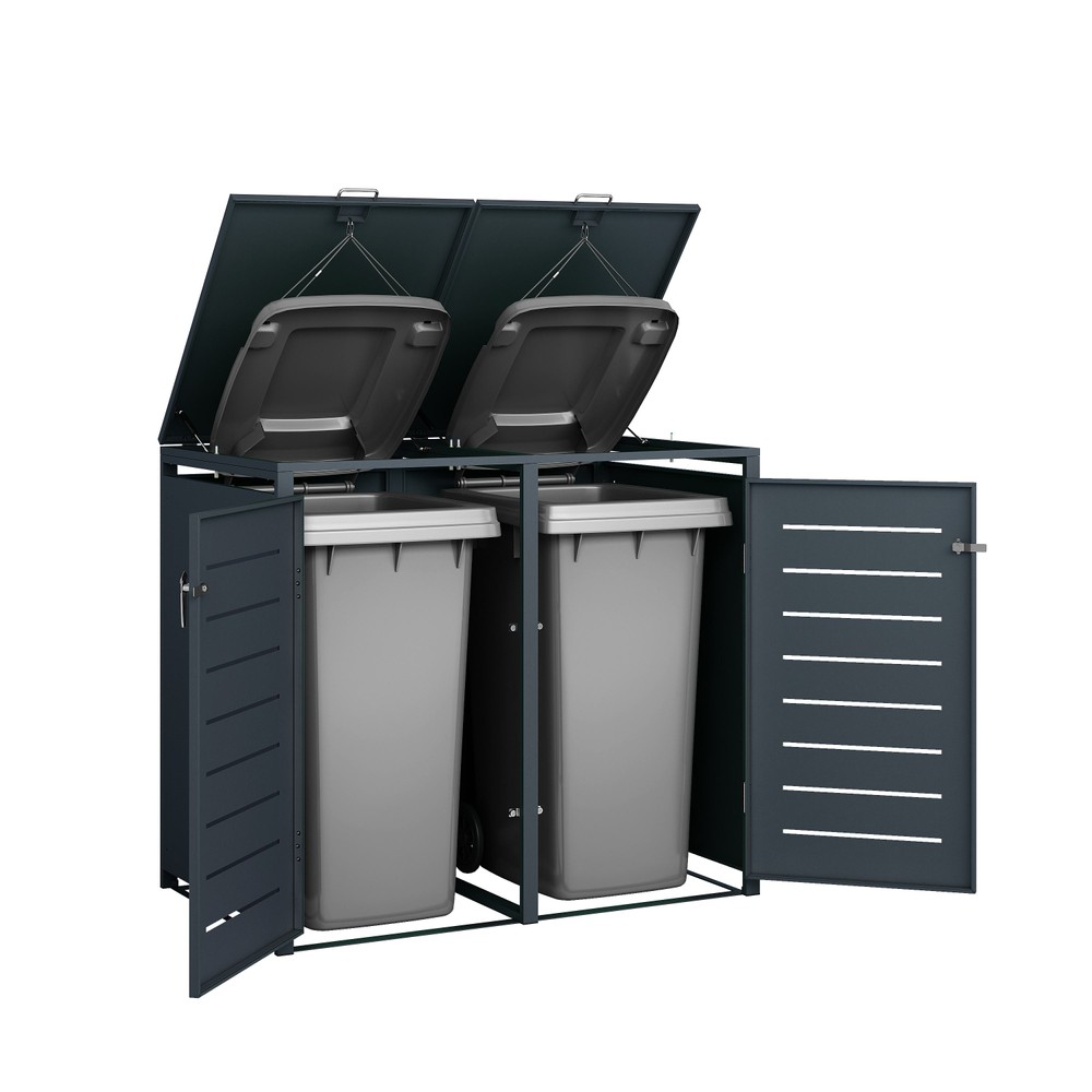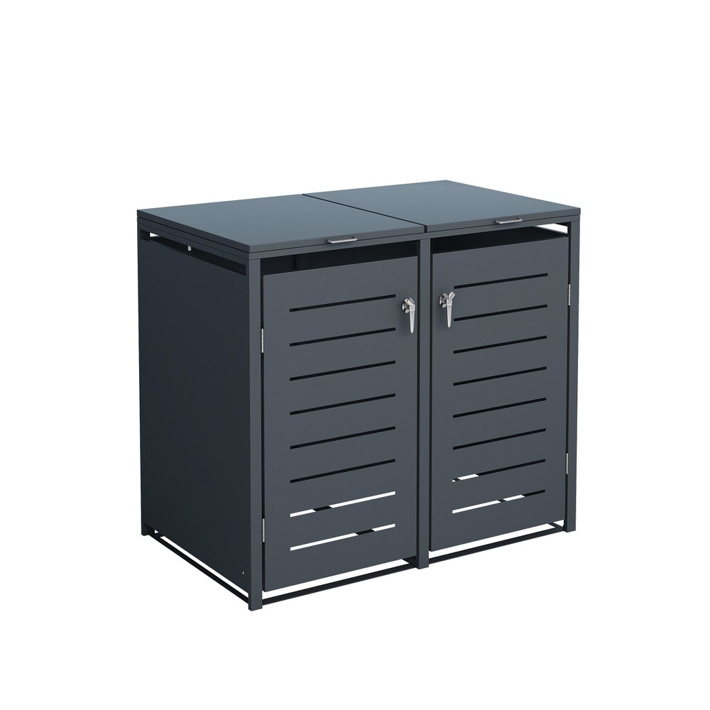 Die Mülltonnenbox aus pulverbeschichtetem Stahl ist die stilvolle Lösung für einen Außenbereich, in dem Ordnung nicht nur praktisch, sondern auch schön sein darf. Mit ihrer klaren Linienführung, der modernen Oberfläche und der robusten Ausstrahlung fügt sie sich dezent in jede Umgebung ein, ob vor dem Einfamilienhaus, im Innenhof oder auf dem Gelände einer Wohnanlage. Gefertigt aus hochwertigem, pulverbeschichtetem Stahl, überzeugt die Mülltonnenbox durch Stabilität, Widerstandskraft und eine langlebige Qualität, auf die man sich im Alltag verlassen kann. Die Pulverbeschichtung schützt das Material zuverlässig vor Witterungseinflüssen und verleiht der Oberfläche zugleich eine elegante, gleichmäßige Optik. So bleibt die Box nicht nur optisch ansprechend, sondern auch besonders pflegeleicht und unempfindlich gegenüber den Anforderungen des täglichen Gebrauchs.