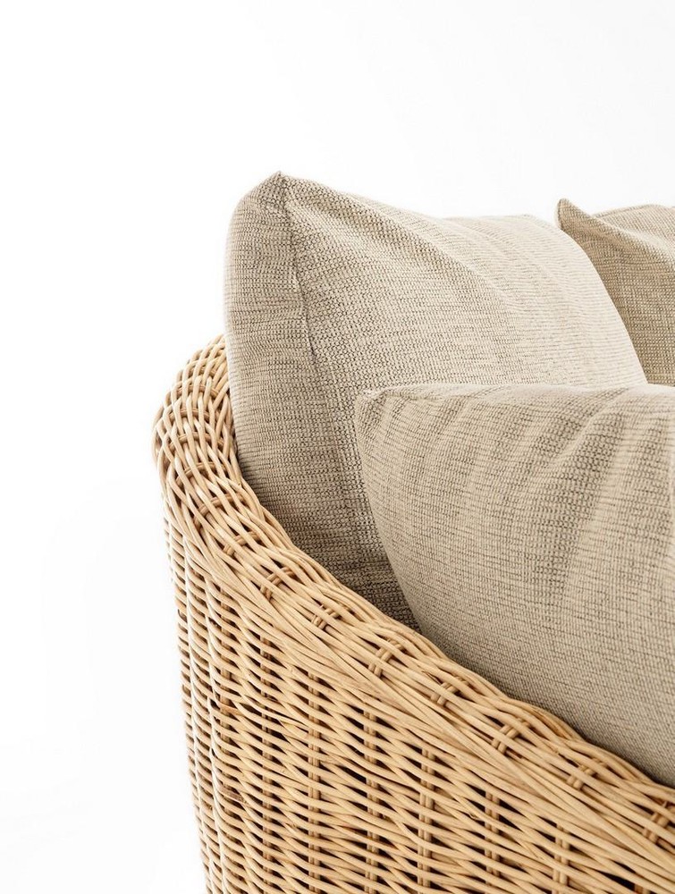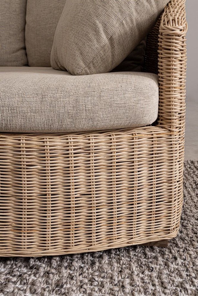 Dieser elegante Sessel verbindet natürlichen Charme mit hochwertiger Handwerkskunst und bietet höchsten Komfort für gemütliche Stunden zu Hause. Die Struktur und das Geflecht aus Rattan verleihen dem Sessel eine warme, organische Ausstrahlung, während die natürliche Nitrocellulose-Beschichtung das Material schützt und seine langlebige Schönheit bewahrt. Das Geflecht sorgt für eine atmungsaktive und flexible Sitzfläche, die sich angenehm an den Körper anpasst. Für zusätzlichen Komfort sorgen fünf abnehmbare Kissen aus hochwertigem Polyestergewebe in Beige, die nicht nur weiche Unterstützung bieten, sondern auch leicht zu reinigen und pflegeleicht sind. Die sanfte Farbgebung harmoniert perfekt mit dem natürlichen Rattan und verleiht dem Sessel ein stilvolles, modernes Erscheinungsbild, das sich vielseitig in Wohn-, Lese- oder Lounge-Bereiche integrieren lässt. Die Füße aus Mangoholz mit natürlichem Finish setzen einen warmen, stabilen Akzent und unterstreichen den hochwertigen Charakter des Sessels. Sie bieten zudem sicheren Stand auf jedem Bodenbelag und runden das Gesamtbild harmonisch ab. Mit seinen großzügigen Abmessungen von ca. 114 x 81,5 x 133 cm bietet der Sessel ausreichend Platz für entspannte Momente, sei es zum Lesen, Ausruhen oder stilvollen Dekorieren Ihres Wohnraums. Die Kombination aus natürlichen Materialien, komfortabler Polsterung und hochwertiger Verarbeitung macht diesen Sessel zu einem echten Blickfang, der jedem Raum Wärme, Stil und Gemütlichkeit verleiht.