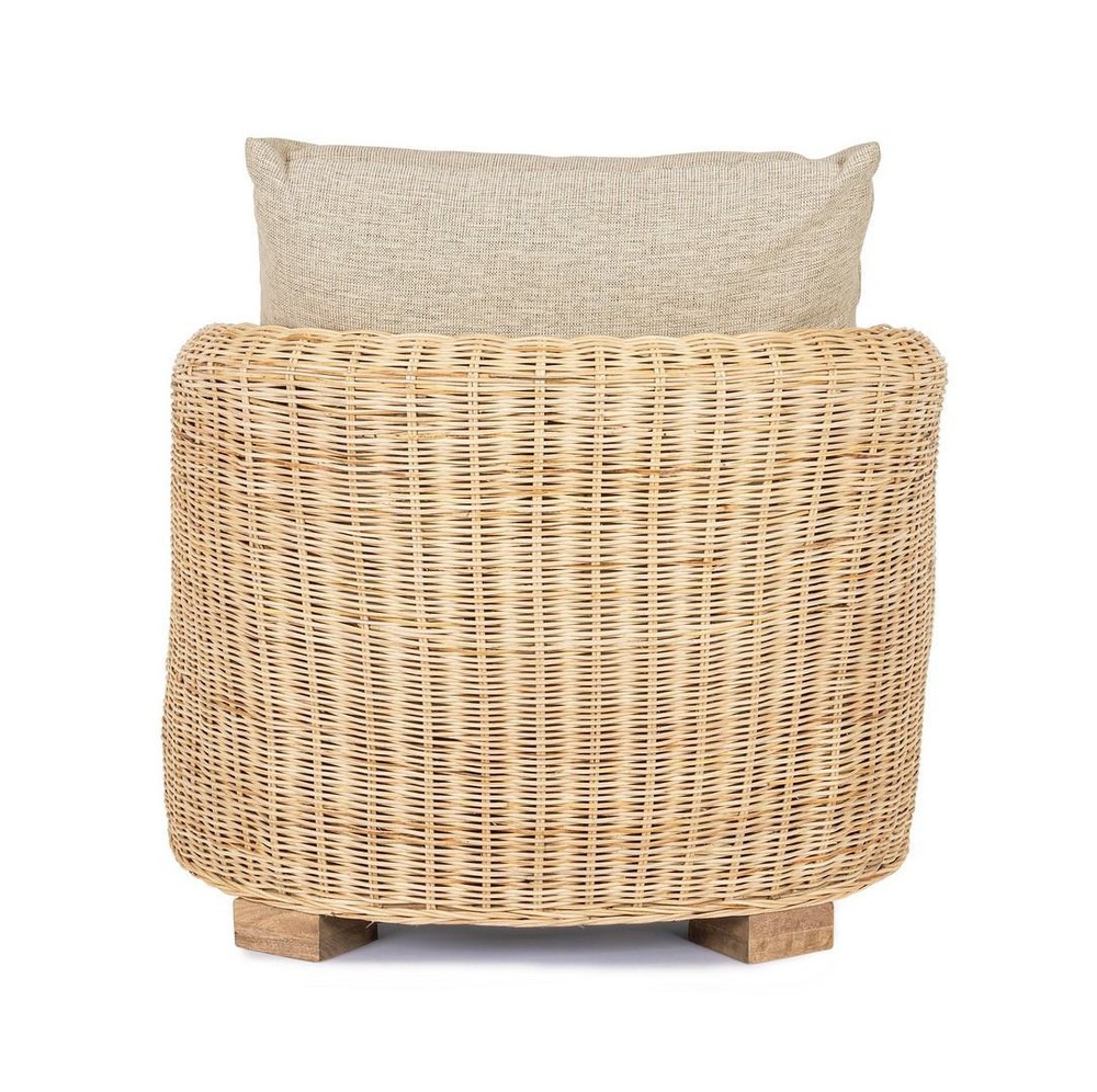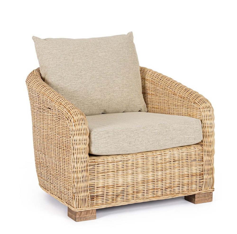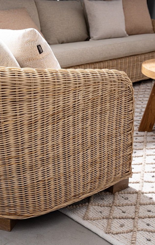 Dieser stilvolle Sessel vereint natürliche Materialien, handwerkliche Verarbeitung und zeitlose Eleganz. Mit seiner warmen Farbgebung, dem weichen Komfort und der authentischen Struktur wird er zum perfekten Rückzugsort in Wohnzimmer, Wintergarten oder auf der überdachten Terrasse. Die Struktur und das Geflecht aus Rattan mit natürlichem Finish verleihen dem Sessel seine charakteristische Leichtigkeit und luftige Optik, die zugleich Robustheit und Stabilität garantiert. Die Oberfläche ist mit einer natürlichen Nitrocellulose-Beschichtung veredelt, die das Holz schützt und gleichzeitig die natürliche Maserung betont. Die Sitz- und Rückenkissen sind hochwertig gepolstert, abziehbar und lassen sich leicht reinigen. In klassischem Beige gehalten, passen sie sich harmonisch an unterschiedliche Einrichtungsstile an und sorgen für ein angenehmes, komfortables Sitzgefühl. Die Füße aus Mangoholz mit natürlichem Finish runden das Design ab und verleihen dem Sessel einen stabilen Stand. Das Zusammenspiel aus Rattan, Naturholz und weichen Kissen macht den Sessel zu einem Möbelstück, das sowohl optisch als auch funktional überzeugt. Mit Maßen von ca. 90 x 63,5 x 78 cm (B x H x T) bietet der Sessel eine komfortable Sitzfläche und fügt sich gleichzeitig platzsparend in unterschiedlichste Wohnbereiche ein.