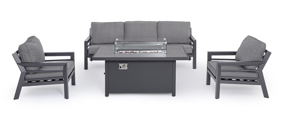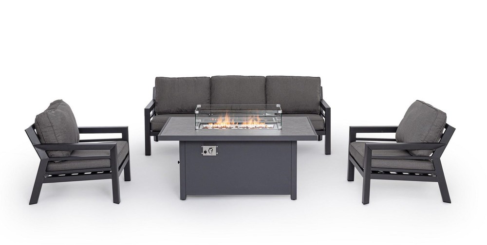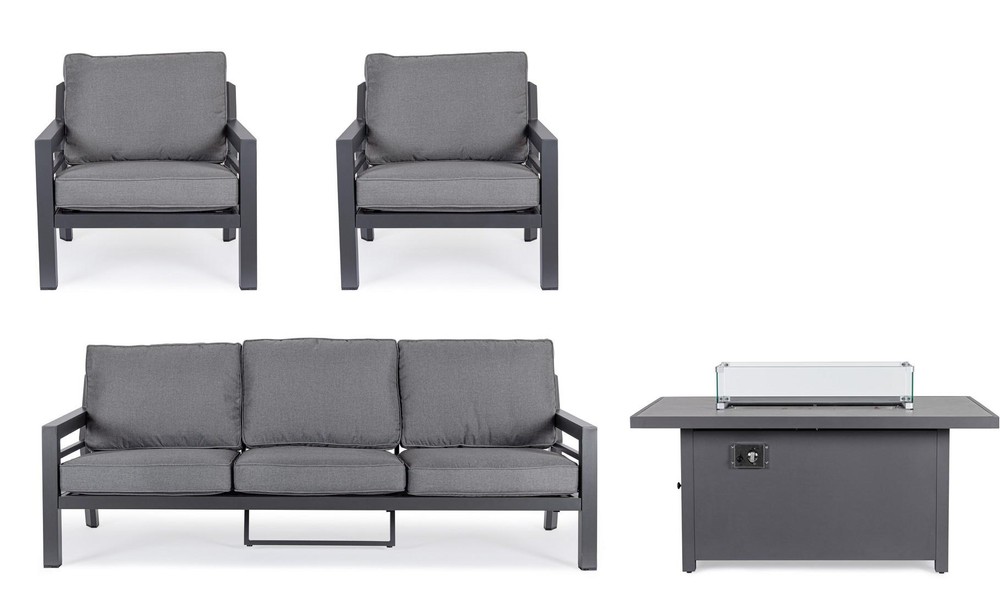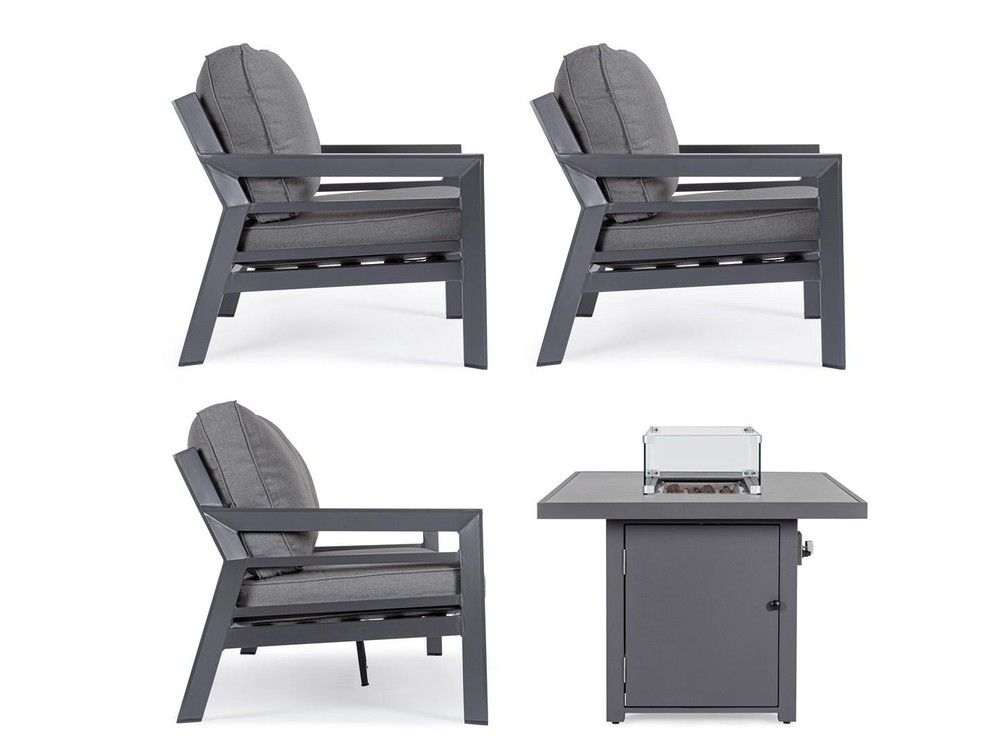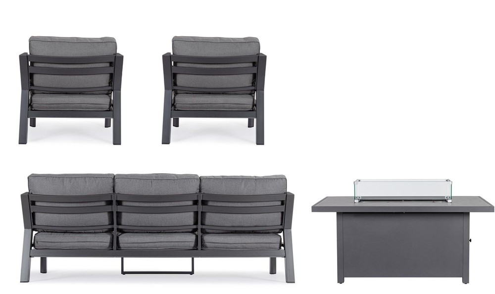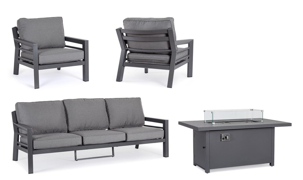 Diese elegante Lounge-Sitzgruppe setzt Design-Akzente in Ihrem Außenbereich und lädt zum Verweilen ein. Diese stilvolle Gartenlounge besteht aus zwei komfortablen Sesseln, einem einladenden Sofa und einem passenden Tisch mit zentraler Feuerstelle, perfekt für entspannte Stunden im Freien. Das Set verbindet modernes Design mit wetterfesten Materialien und bietet ausreichend Platz für gemütliche Gespräche oder entspannte Lesestunden. Dank der bequemen Polster und der harmonischen Formensprache wird Ihre Terrasse oder Ihr Garten zum neuen Lieblingsplatz für Familie und Freunde. Ideal für alle, die Komfort und Ästhetik im Outdoorbereich schätzen. Die anthrazitfarbene Oberfläche verleiht der Garnitur ein edles, zurückhaltendes Aussehen und schützt den Rahmen dauerhaft vor Korrosion.