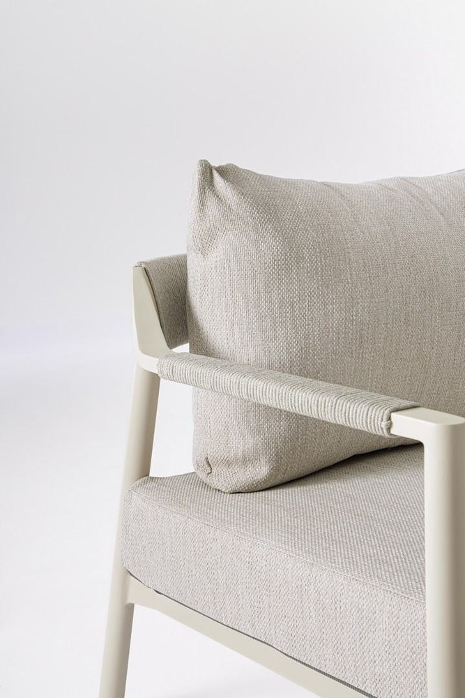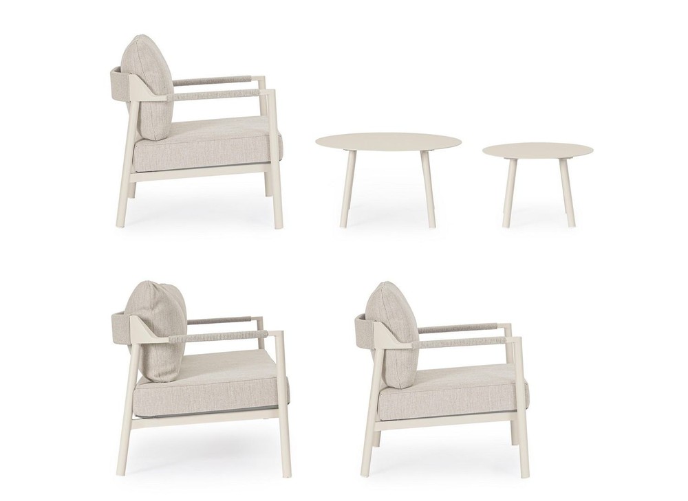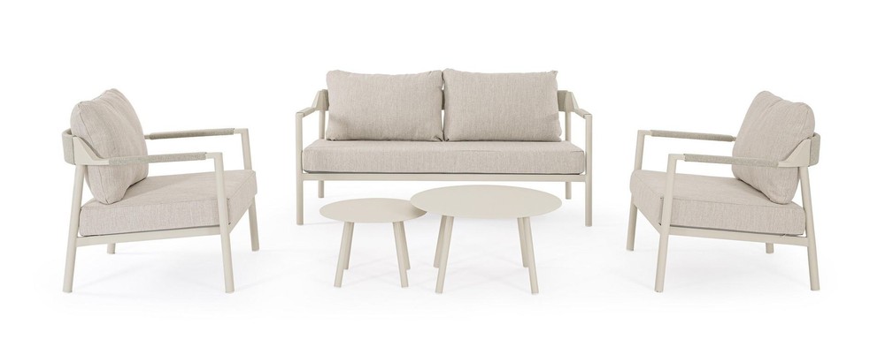Diese elegante Lounge-Sitzgruppe setzt Design-Akzente in Ihrem Außenbereich und lädt zum Verweilen ein. Diese stilvolle Gartenlounge besteht aus zwei komfortablen Sesseln, einem einladenden Sofa und zwei passenden Tischen, perfekt für entspannte Stunden im Freien. Das Set verbindet modernes Design mit wetterfesten Materialien und bietet ausreichend Platz für gemütliche Gespräche oder entspannte Lesestunden. Dank der bequemen Polster und der harmonischen Formensprache wird Ihre Terrasse oder Ihr Garten zum neuen Lieblingsplatz für Familie und Freunde. Ideal für den sommerlichen Abend – hier trifft modernes Design auf gemütliche Atmosphäre. Die beige Oberfläche verleiht der Garnitur ein edles, zurückhaltendes Aussehen und schützt den Rahmen dauerhaft vor Korrosion.
