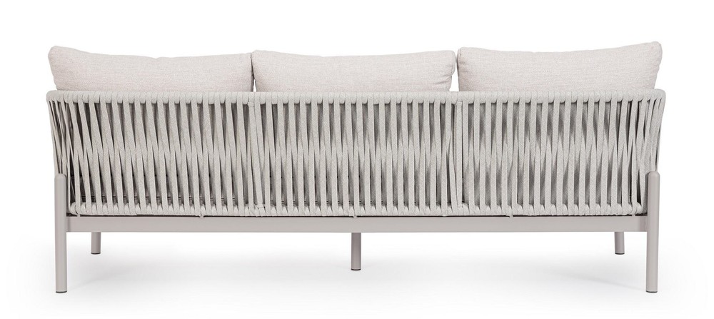 Dieses elegante Outdoor-Sofa überzeugt durch eine moderne Struktur und hochwertige Materialien, die Design und Komfort perfekt vereinen. Der stabile Rahmen aus pulverbeschichtetem Aluminium präsentiert sich in einem edlen grauen Finish und sorgt für Langlebigkeit sowie eine klare, zeitlose Optik. Die Arm- und Rückenlehnen sind zusätzlich mit robusten Polyesterseilen in harmonischem Grau bespannt, was dem Sofa eine stilvolle, luftige Note verleiht und Ihnen zugleich angenehme Unterstützung bietet. Für Ihren persönlichen Sitzkomfort sorgen ein großzügiges Sitzkissen sowie drei weiche Rückenlehnenkissen. Die Bezüge bestehen aus wasserabweisendem Olefin-Gewebe (Polypropylen) in Grau – ideal für den Outdoor-Bereich, da sie pflegeleicht, strapazierfähig und abnehmbar sind. So bleibt das Sofa auch bei häufigem Gebrauch stets gepflegt und einladend. Mit seinen großzügigen Maßen von ca. 85 × 86 × 220 cm (Breite × Höhe × Tiefe) bietet Ihnen das Sofa reichlich Platz zum Entspannen, Lesen oder für gesellige Momente im Garten, auf der Terrasse oder im Wintergarten. Dieses stilvolle, moderne Möbelstück verbindet Komfort, Funktionalität und elegantes Design zu einem harmonischen Gesamtbild, das Ihren Außenbereich aufwertet.