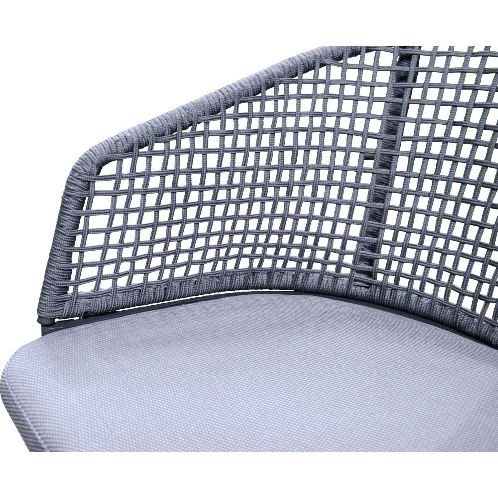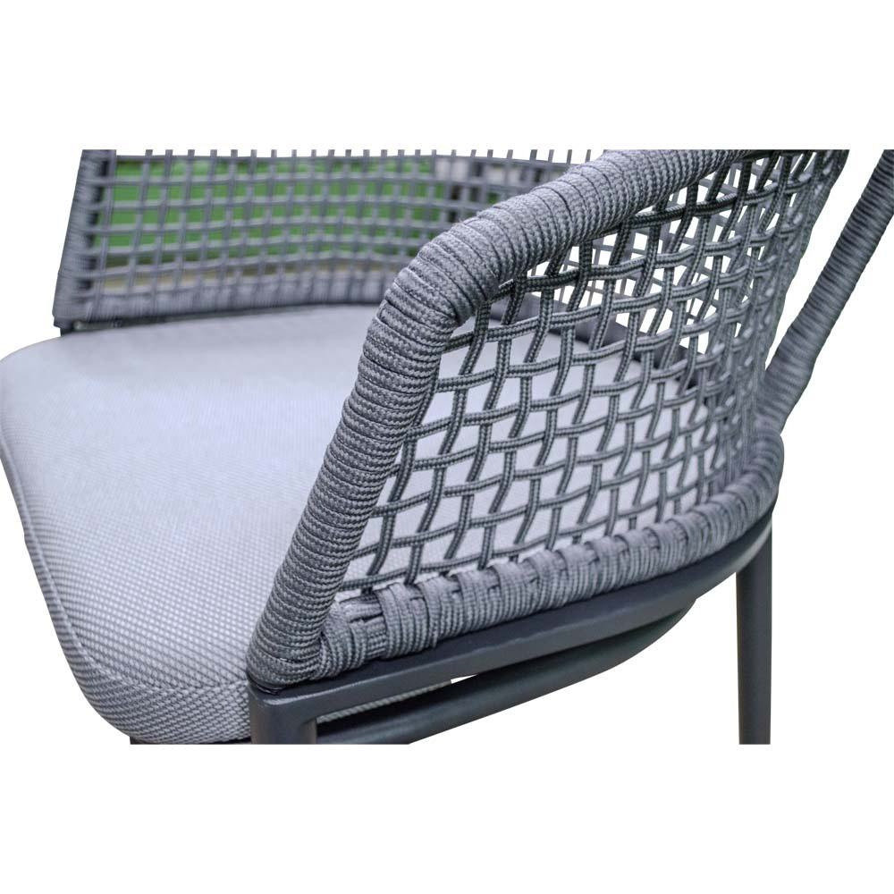 Die Bespannung aus Ø 4 mm Seil in Dunkelgrau verleiht dem Stuhl eine zeitgemäße Leichtigkeit und unterstützt ein komfortables Sitzgefühl. Ergänzt wird der Sitzkomfort durch die Olefin-Polsterung mit 270 g/m², die strapazierfähig und pflegeleicht ist. Mit einer maximalen Traglast von 120 kg ist der Stuhl robust und ideal für den täglichen Gebrauch geeignet.