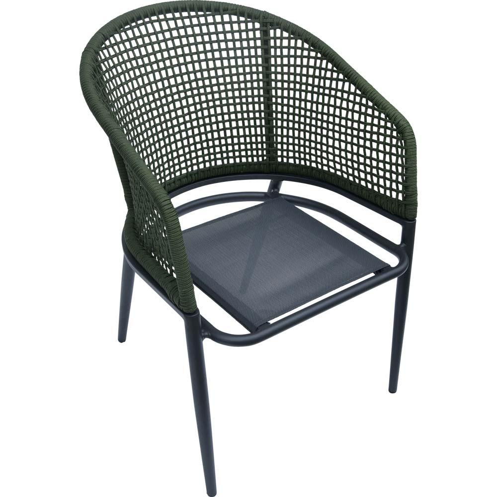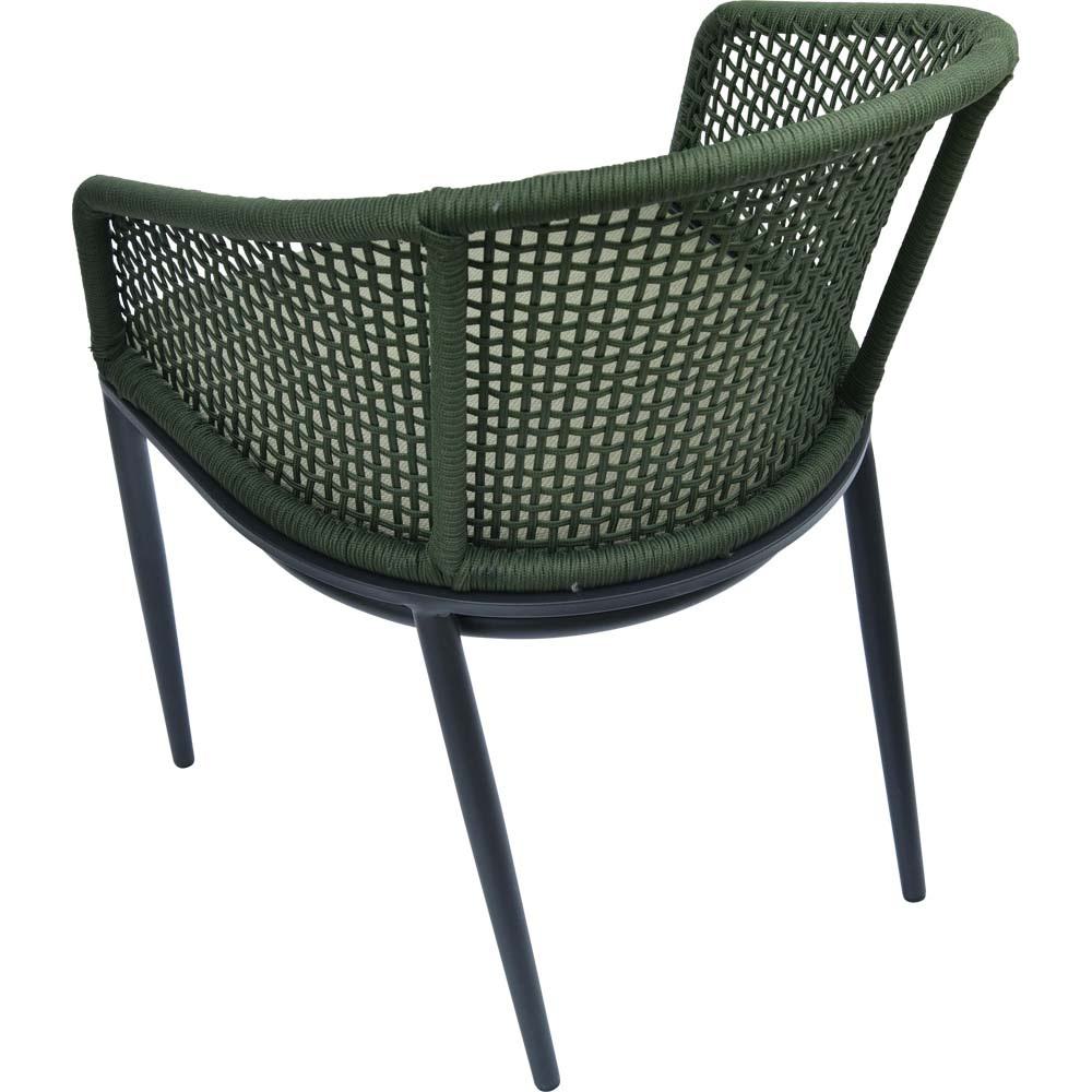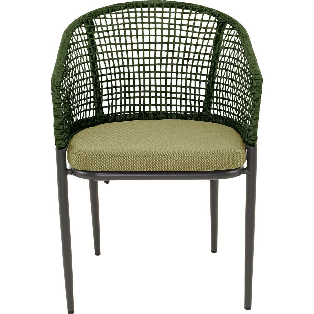 Die Bespannung aus Ø 4 mm Seil in Grün verleiht dem Stuhl eine zeitgemäße Leichtigkeit und unterstützt ein komfortables Sitzgefühl. Ergänzt wird der Sitzkomfort durch die Olefin-Polsterung mit 270 g/m², die strapazierfähig und pflegeleicht ist. Mit einer maximalen Traglast von 120 kg ist der Stuhl robust und ideal für den täglichen Gebrauch geeignet.