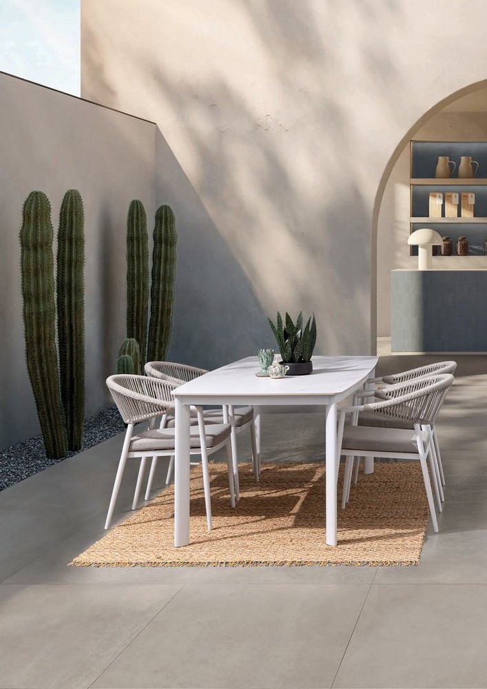 Klare Linien, helle Farben und langlebige Materialien machen diesen Esstisch zu einem stilvollen Herzstück für Ihren Outdoor-Bereich. Ob auf der Terrasse, im Garten oder unter einer überdachten Veranda – dieser Tisch bringt moderne Leichtigkeit und funktionale Eleganz nach draußen und schafft den idealen Ort für gemeinsame Stunden mit Familie und Freunden. Das Gestell besteht aus robustem Aluminium, das mit einer hochwertigen Pulverbeschichtung in strahlendem Weiß veredelt wurde. Diese Oberfläche verleiht dem Tisch nicht nur seine moderne, frische Optik, sondern schützt das Material zuverlässig vor Korrosion, Feuchtigkeit und UV-Strahlung. Das Ergebnis ist eine langlebige Konstruktion, die Wind und Wetter mühelos standhält – und dabei dauerhaft gut aussieht. Die Tischplatte aus gesintertem Stein greift den hellen, klaren Look auf und ergänzt das Gesamtbild mit einer eleganten, steinähnlichen Oberfläche in Weiß. Dieses innovative Material überzeugt durch außergewöhnliche Widerstandsfähigkeit. Es ist kratzfest, hitze- und UV-beständig sowie wasserabweisend und somit optimal für den täglichen Einsatz im Freien geeignet. Die leicht strukturierte Oberfläche bietet eine edle Haptik und ist dabei besonders pflegeleicht – ein feuchtes Tuch genügt, um den Tisch im Handumdrehen sauber zu halten. Mit seinen Maßen von etwa 180 Zentimetern in der Breite, 90 Zentimetern in der Tiefe und einer Höhe von rund 75 Zentimetern bietet der Tisch großzügig Platz für bis zu sechs Personen. Ganz gleich, ob Sie ein sommerliches Abendessen mit Gästen planen, ein entspanntes Frühstück zu zweit genießen oder einfach einen stilvollen Arbeitsplatz im Grünen suchen – dieser Tisch passt sich Ihrem Outdoor-Leben mühelos an.