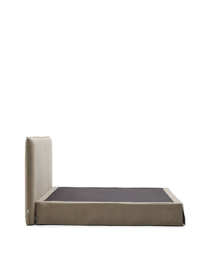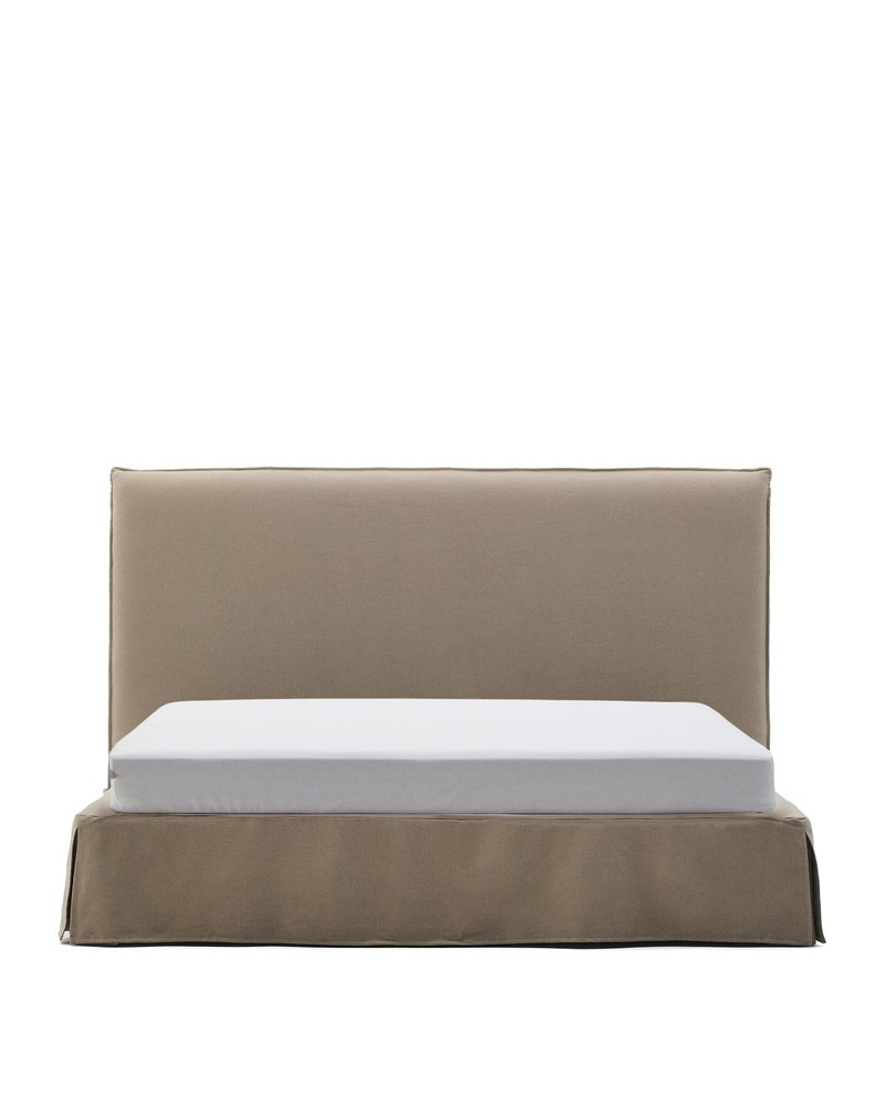 Dieses abziehbare Polsterbett für Matratzen der Größe 180 × 200 cm vereint elegantes Design, hochwertigen Komfort und praktische Funktionalität in einem Möbelstück. Mit seiner großzügigen Liegefläche bietet es Ihnen ausreichend Platz für erholsame Nächte und setzt zugleich einen stilvollen Akzent in Ihrem Schlafzimmer. Der Bezug aus natürlichem Baumwoll- und Leinengewebe in Taupe sorgt für eine warme, einladende Optik und ein angenehm weiches Hautgefühl. Dank der sanforisierten Oberfläche gewinnt der Stoff zusätzliche Weichheit, bleibt formstabil und behält über lange Zeit seine edle Struktur. So vereint der Bezug natürliche Haptik, Langlebigkeit und pflegeleichte Eigenschaften in perfekter Harmonie. Die Struktur mit gepolstertem Unterbau macht einen separaten Lattenrost überflüssig. Dadurch entsteht eine stabile, komfortable Liegefläche, die Ihr Körpergewicht gleichmäßig unterstützt und für ein besonders angenehmes Schlafgefühl sorgt. Gleichzeitig verleiht der Unterbau dem Bett eine elegante, aufgeräumte Silhouette. Der Rahmen aus hochwertiger Spanplatte und robustem Stahl garantiert Stabilität, Formtreue und eine langlebige Konstruktion. Das Zusammenspiel dieser Materialien sorgt dafür, dass das Bett auch bei täglicher Nutzung seine Stabilität behält und gleichzeitig ein elegantes, hochwertiges Erscheinungsbild bietet. Mit seinen Maßen von ca. 210 × 200 × 118 cm (L × B × H) wirkt das Bett großzügig und einladend, während das gepolsterte Kopfteil zusätzlichen Komfort beim Lesen, Entspannen oder Fernsehen bietet. Die sanfte Farbgebung in Taupe lässt sich harmonisch in verschiedene Einrichtungsstile integrieren – von modern-minimalistisch bis zu klassisch-gemütlich. Dieses abziehbare Polsterbett kombiniert hochwertige Materialien, durchdachte Funktionalität und stilvolles Design auf perfekte Weise
