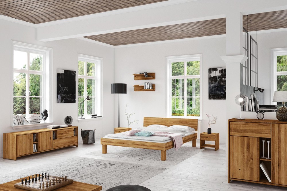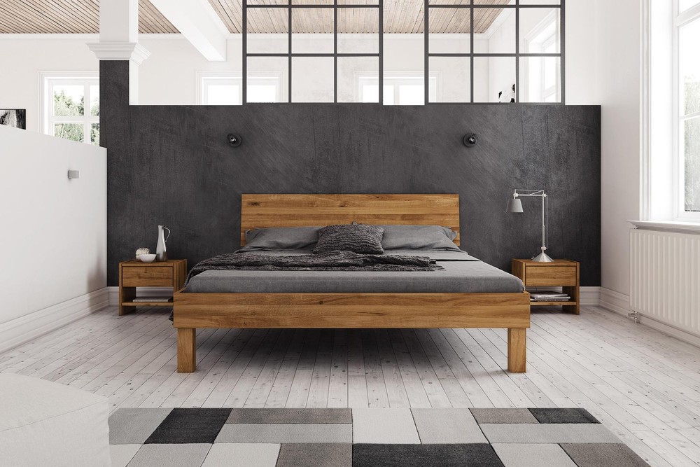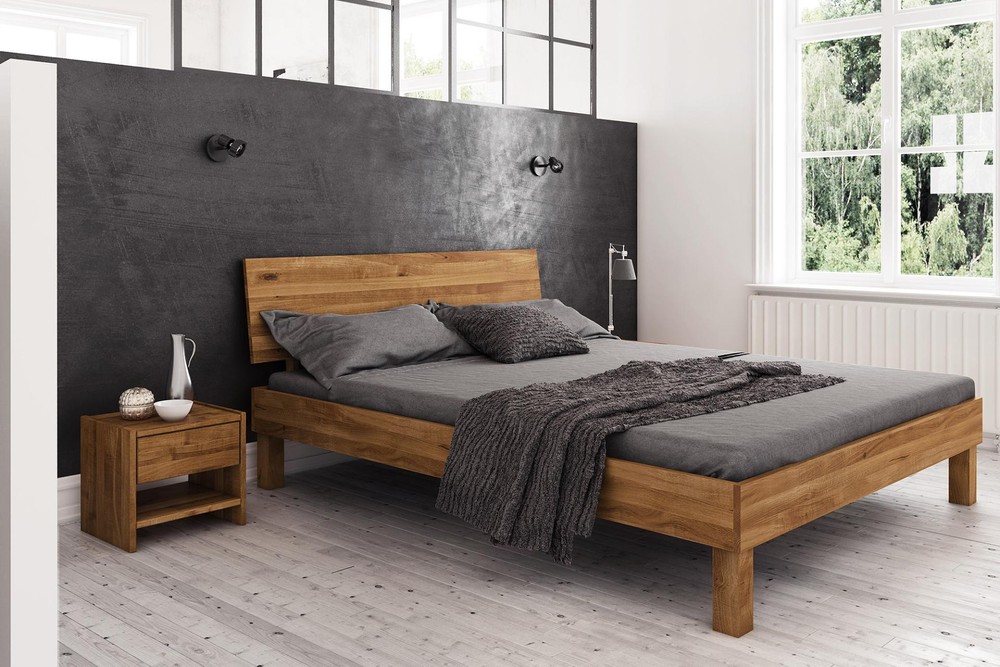 Ein Bett aus massiver geölter Wildeiche mit Holzkopfteil und Holzbeinen