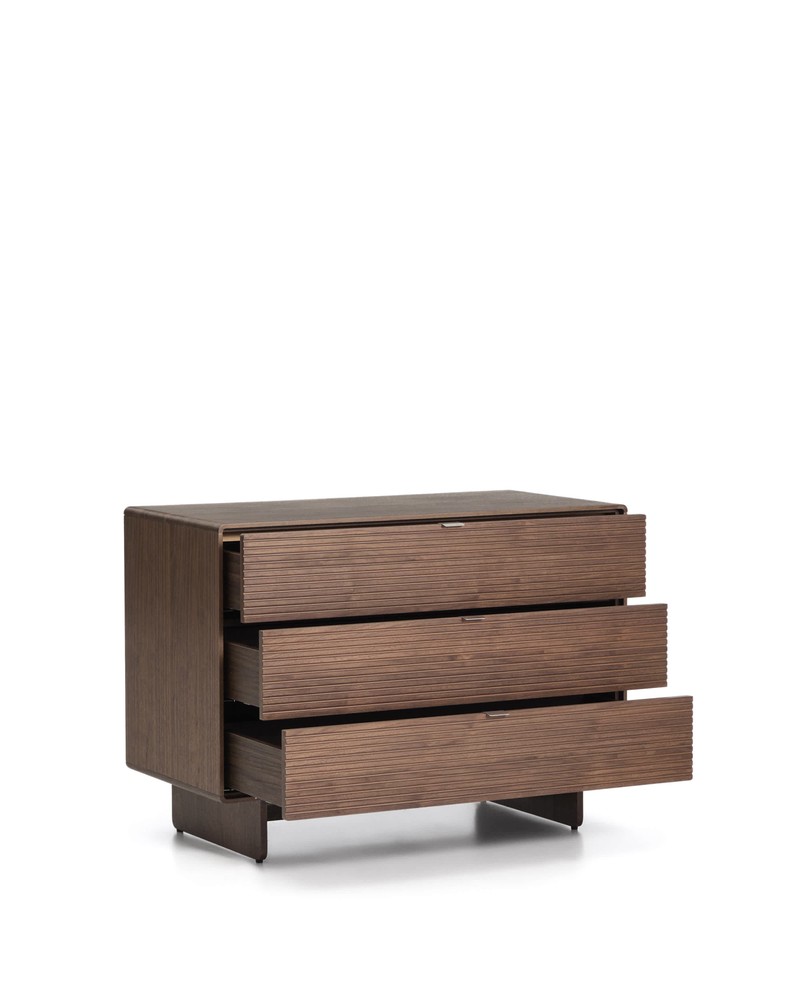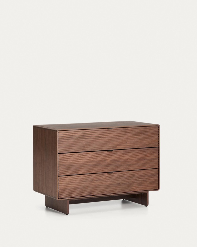 Diese elegante Kommode vereint modernes Design mit hochwertiger Verarbeitung und wird so zu einem stilvollen Highlight in Ihrem Zuhause. Gefertigt aus robustem MDF und veredelt mit edlem Walnussfurnier, überzeugt sie durch ihre warme, natürliche Ausstrahlung und eine harmonische Holzmaserung. Die zeitlose Optik lässt sich vielseitig kombinieren und fügt sich sowohl in moderne als auch in klassische Einrichtungskonzepte nahtlos ein. Drei großzügige Schubladen bieten Ihnen viel Stauraum für Kleidung, Unterlagen, Wohnaccessoires oder Alltagsgegenstände. Dank der verdeckt integrierten Führungen entsteht ein besonders klares und hochwertiges Gesamtbild. Das komfortable Soft-Close-System sorgt dafür, dass sich die Schubladen sanft und nahezu geräuschlos schließen – für mehr Wohnkomfort und eine angenehme Atmosphäre in Ihren Räumen. Die Griffe aus gebürstetem, rostfreiem Edelstahl setzen einen modernen Akzent. Ihr satiniertes Finish reduziert die Sichtbarkeit von Fingerabdrücken und feinen Kratzern und trägt so zu einer dauerhaft gepflegten Optik bei. Durch das leicht geneigte Design lassen sich die Schubladen besonders bequem und ergonomisch öffnen. Praktische Stellfüße ermöglichen Ihnen zudem den einfachen Ausgleich von Bodenunebenheiten. So steht die Kommode jederzeit stabil und sicher – selbst auf leicht unebenen Untergründen. Mit ihren Maßen von ca. 101 cm Breite, 75 cm Höhe und 50 cm Tiefe bietet Ihnen die Kommode eine ideale Kombination aus kompaktem Format und großzügigem Stauraum. Sie erhalten ein Möbelstück, das Funktionalität, Komfort und zeitlose Eleganz auf harmonische Weise miteinander verbindet.