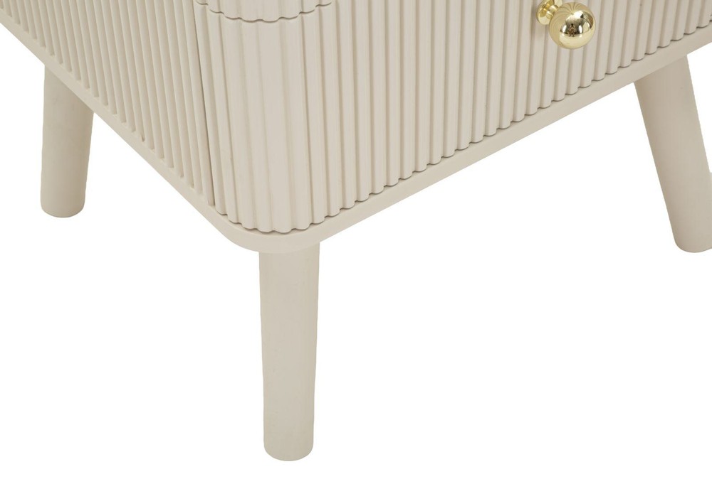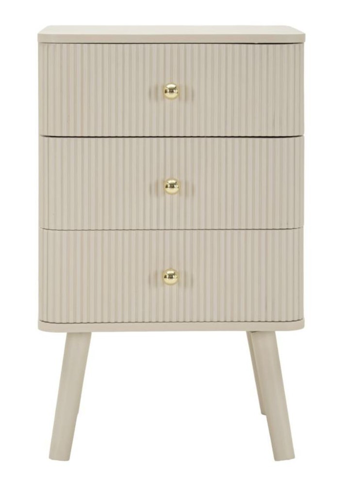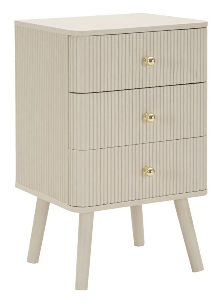 Dieser stilvolle Nachttisch aus MDF und Pinie vereint elegantes Design, hochwertige Verarbeitung und praktische Funktionalität. Das weiße Finish verleiht dem Möbelstück eine helle, moderne Ausstrahlung, während die runden Griffe aus Eisen mit goldenem Finish raffinierte Akzente setzen und dem Nachttisch einen luxuriösen Touch verleihen. Mit den Maßen von ca. 37,5 x 61 x 34 cm (Breite x Höhe x Tiefe) passt er perfekt neben jedes Bett und bietet gleichzeitig ausreichend Ablagefläche für Lampen, Bücher oder Dekorationen. Der Nachttisch verfügt über drei untereinander angeordnete Schubladen, die praktischen Stauraum für persönliche Gegenstände, Schmuck oder andere Utensilien bieten. Die feinen Linien und vertikalen Strukturen auf den Schubladenfronten unterstreichen die moderne, grafische Optik des Möbels und sorgen für eine dezente Eleganz, die sich harmonisch in verschiedene Schlafzimmerstile einfügt. Durch die gelungene Kombination aus funktionalem Stauraum, klarer Linienführung und dekorativen Details ist dieser Nachttisch nicht nur praktisch, sondern auch ein stilvoller Blickfang in Ihrem Schlafzimmer. Er schafft eine ordentliche und gleichzeitig elegante Atmosphäre, die Ihrem Raum Struktur und Persönlichkeit verleiht.