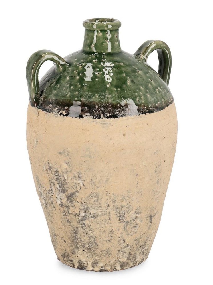 Dieses charmante Set aus zwei Amphoren aus Terrakotta vereint rustikalen Charakter mit handwerklicher Eleganz und wird zu einem besonderen Blickfang in Ihrem Innen- oder Außenbereich. Die zeitlose Formensprache der Amphoren erinnert an klassische Gefäße, während die harmonische Farbgestaltung – oben Grün, unten Beige – einen natürlichen und zugleich lebendigen Akzent setzt. Dank der robusten Terrakotta-Verarbeitung sind die Amphoren sowohl für den Einsatz im Innen- als auch im Außenbereich geeignet. Ob auf der Terrasse, dem Balkon, im Garten oder als stilvolles Dekorationselement im Wohnraum – sie bringen rustikalen Charme und natürliche Ästhetik in jede Umgebung. Jedes Stück ist ein handgefertigtes Unikat. Kleine Abweichungen in Farbe, Farbton oder leichte Unvollkommenheiten sind kein Mangel, sondern Ausdruck der Individualität und Einzigartigkeit jedes Amphorenpaares. Die warme Haptik und die authentische Oberfläche unterstreichen den rustikalen Charakter und machen jedes Exemplar zu einem besonderen Dekorationsstück. Mit Maßen von ca. 19,5 × 33,5 × 21,5 cm (Breite × Höhe × Tiefe) setzen die Amphoren sowohl einzeln als auch gemeinsam wirkungsvolle Akzente. Ob bepflanzt oder als dekorative Vasen genutzt, sie schaffen eine natürliche, harmonische Atmosphäre und verleihen Ihrem Zuhause oder Außenbereich einen stilvollen, handgefertigten Touch. Ein ideales Dekorationsset für alle, die rustikales Design, natürliche Materialien und hochwertige Handarbeit schätzen und Räume oder Gärten mit einzigartigen, stilvollen Akzenten gestalten möchten.
