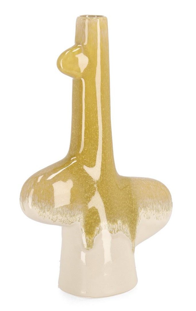 Dieses außergewöhnliche Set aus zwei Kerzenhaltern aus Terrakotta vereint kunstvolles Design mit natürlicher Materialität und wird zu einem stilvollen Blickfang in Ihrem Wohnraum. Die abstrakte, organische Formgebung verleiht jedem Kerzenhalter eine skulpturale Wirkung und unterstreicht den handwerklichen Charakter dieses besonderen Wohnaccessoires. Die harmonische Farbgestaltung in Gelb und Weiß mit einem sanften Farbverlauf – oben warmes Gelb, nach unten in Beige-Weiß übergehend – sorgt für eine lebendige, zugleich ruhige Ausstrahlung. Die natürlichen Farbtöne lassen sich vielseitig kombinieren und fügen sich sowohl in moderne als auch in mediterrane oder boho-inspirierte Einrichtungsstile ein. Jeder Kerzenhalter ist ein handgefertigtes Unikat. Kleine Abweichungen in Farbe, Farbton oder feine Unvollkommenheiten sind kein Mangel, sondern ein bewusstes Merkmal der Individualität und unterstreichen die Einzigartigkeit jedes einzelnen Stücks. Die Terrakotta verleiht den Kerzenhaltern eine warme, authentische Haptik und eine natürliche Ausstrahlung. Mit ihren großzügigen Maßen von ca. 8,5 × 34,5 × 22,5 cm (Breite × Höhe × Tiefe) setzen die Kerzenhalter eindrucksvolle Akzente – einzeln platziert oder gemeinsam als harmonisches Duo. Ob auf dem Boden, einem Sideboard oder als dekoratives Element im Wohn- oder Essbereich: Dieses Set schafft eine stimmungsvolle Atmosphäre und verbindet künstlerischen Ausdruck mit handwerklicher Qualität. Ein besonderes Wohnaccessoire für alle, die Individualität, natürliche Materialien und ausdrucksstarkes Design schätzen.