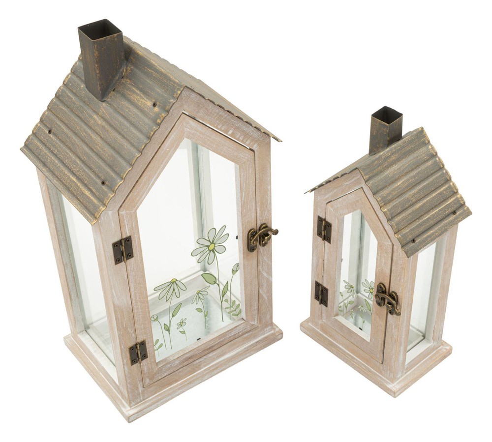 Dieses Set aus zwei Laternen aus Holz vereint rustikalen Charme mit eleganten Details und wird zu einem stimmungsvollen Dekorationshighlight in Ihrem Zuhause. Beide Laternen sind in einem zarten Rosaton gehalten, der Wärme und Sanftheit ausstrahlt, und verfügen über silk-screened Glasplatten mit floralem Motiv, die beim Anzünden von Kerzen oder LED-Lichtern zauberhafte Lichtspiele erzeugen. Die Hausform der Laternen unterstreicht ihren dekorativen Charakter und verleiht ihnen eine heimelige, zugleich verspielte Note. Das natürliche Holzfinish harmoniert perfekt mit dem floralen Muster auf dem Glas und sorgt für eine ausgewogene Kombination aus rustikaler Gemütlichkeit und eleganter Raffinesse. Ob als stimmungsvolles Ensemble auf einem Sideboard, Regal oder Fensterbrett oder als dekoratives Highlight auf dem Tisch – die Laternen setzen charmante Akzente in jedem Raum. Das Set besteht aus zwei unterschiedlich großen Laternen: Die größere Laterne misst ca. 18 x 36 x 13 cm (Breite x Höhe x Tiefe) und bietet ausreichend Platz für größere Kerzenarrangements, während die kleinere Laterne mit ca. 2,5 x 25 x 8,5 cm (Breite x Höhe x Tiefe) ideal für kleinere Lichter oder als ergänzendes Dekorationselement geeignet ist. Zusammen bilden sie ein harmonisches Duo, das ästhetisches Design, liebevolle Details und stimmungsvolles Licht auf besondere Weise vereint.