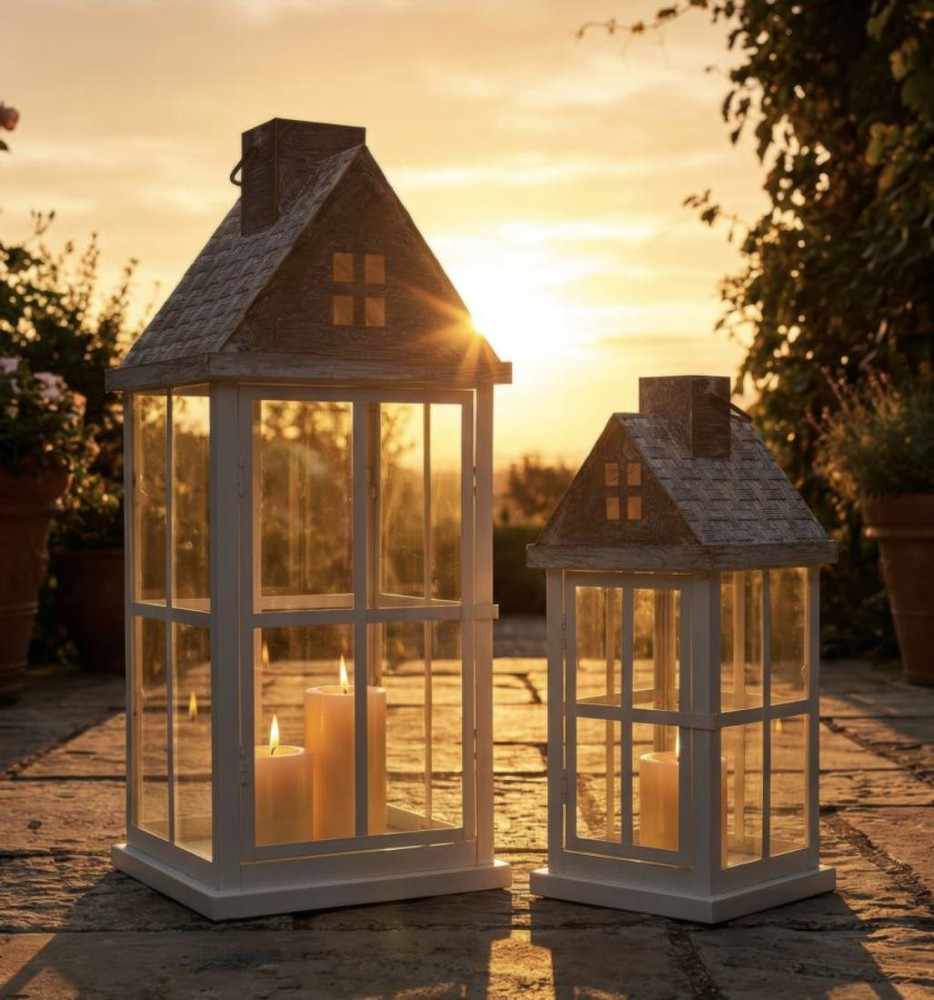 Dieses stilvolle Set aus zwei Laternen aus Holz verbindet natürliche Materialien mit einem charmanten, dekorativen Design. Die Laternen sind im liebevollen Cottage-Stil gestaltet und erinnern mit ihrem schrägen Dach sowie den dekorativen Sprossenfenstern an kleine, gemütliche Häuschen. Dadurch schaffen Sie im Handumdrehen eine warme und einladende Atmosphäre, die sich ideal für Ihr Wohnzimmer, den Eingangsbereich, die Terrasse oder den Balkon eignet. Die Kombination aus der natürlichen Holzstruktur und den transparenten Glaseinsätzen verleiht den Laternen eine besonders elegante Ausstrahlung. Das Licht von Kerzen oder LED-Lichtern kann sich durch das Glas wunderbar entfalten und sorgt für eine angenehme, stimmungsvolle Beleuchtung, die Ihr Zuhause noch gemütlicher wirken lässt. Gleichzeitig unterstreicht das hochwertige Zusammenspiel von Holz und Glas den dekorativen Charakter der Laternen und macht sie zu einem stilvollen Blickfang. Dank der zwei unterschiedlichen Größen lassen sich die Laternen vielseitig dekorieren. Sie können diese gemeinsam als harmonisches Set arrangieren oder einzeln platzieren, um gezielt dekorative Akzente zu setzen. Ob auf dem Boden, auf einem Sideboard, im Wintergarten oder im geschützten Außenbereich – mit diesen Laternen schaffen Sie eine behagliche Atmosphäre und eine stilvolle Lichtstimmung. Die Maße der großen Laterne betragen ca. 24,5 x 55 x 24,5 cm (Breite x Höhe x Tiefe), während die kleinere Laterne ca. 17 x 37,5 x 17 cm (Breite x Höhe x Tiefe) misst. Dieses dekorative Laternen-Set eignet sich hervorragend, um Ihrem Zuhause eine gemütliche Landhaus-Note zu verleihen und gleichzeitig elegante Lichtakzente zu setzen.