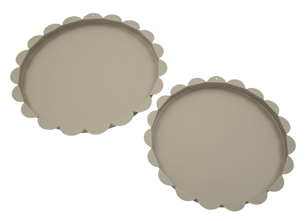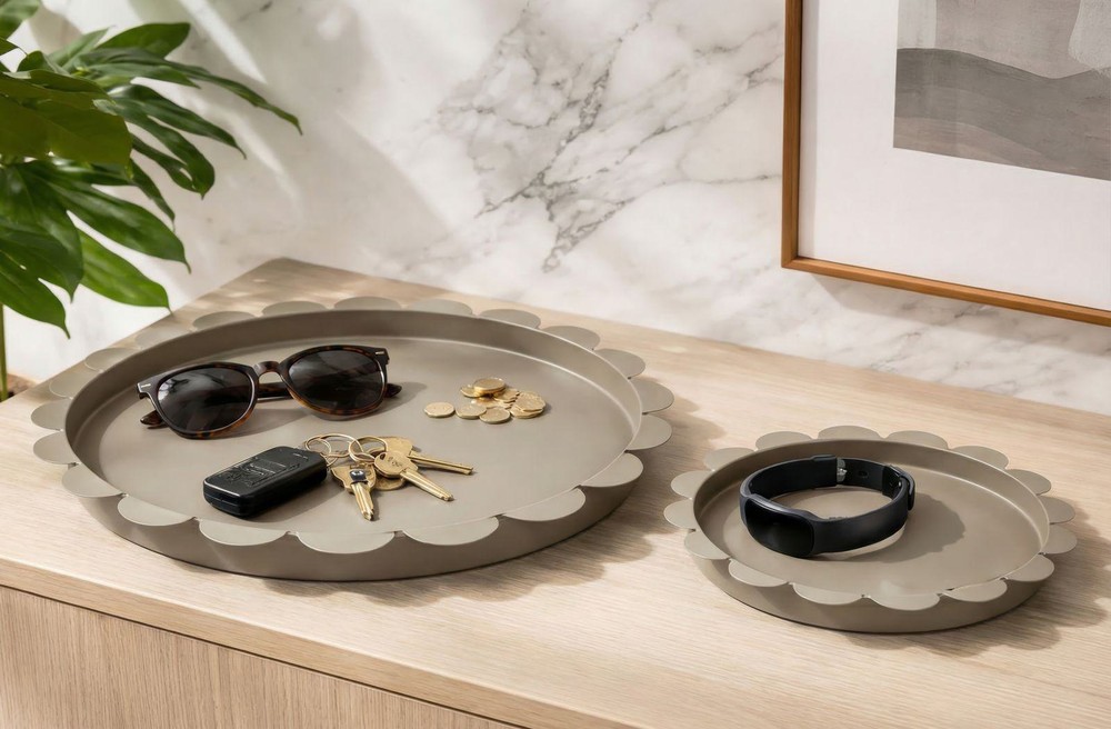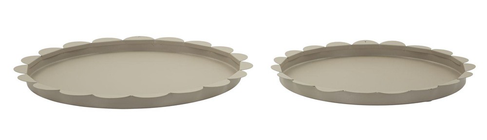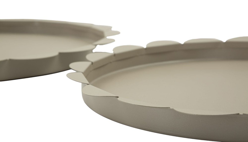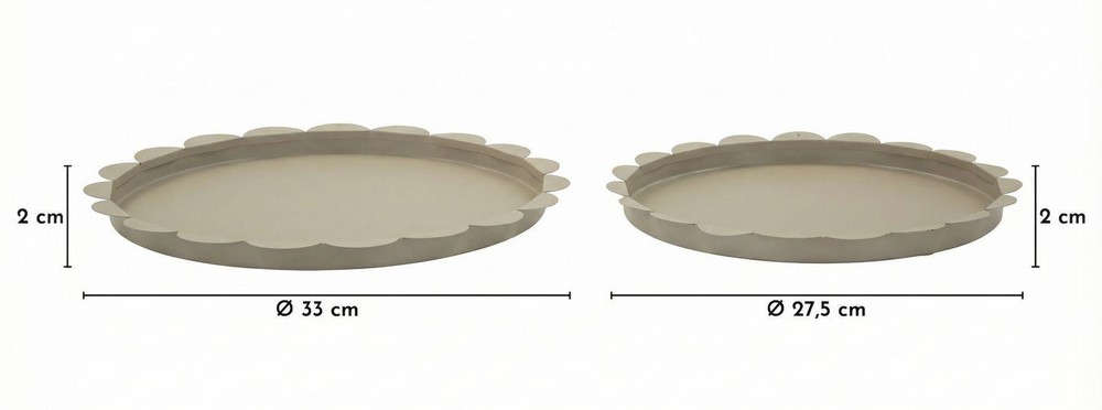 Dieses Set aus zwei runden Tabletts aus Metall verbindet modernes Design mit vielseitiger Funktionalität. Die wellenförmig gestaltete Kante verleiht den Tabletts eine elegante, fließende Form, während das graue, matte Finish für eine zeitlose und stilvolle Optik sorgt, die sich harmonisch in verschiedene Einrichtungsstile einfügt. Dank ihres schlichten, modernen Designs lassen sich die Tabletts vielseitig einsetzen – zum Beispiel als praktische Ablage für Schlüssel, Schmuck oder andere Kleinigkeiten, als dekoratives Centerpiece auf dem Couchtisch oder Esstisch oder als stilvolle Basis für Kerzen, Vasen und andere Wohnaccessoires. Das Set besteht aus zwei Größen, die sowohl zusammen als auch einzeln verwendet werden können. Das größere Tablett misst ca. 33 x 2 x 33 cm (Breite x Höhe x Tiefe), während das kleinere Tablett ca. 27,5 x 2 x 27,5 cm (Breite x Höhe x Tiefe) misst. Zusammen bilden sie ein harmonisches Duo, das Funktionalität und moderne Eleganz in Ihr Zuhause bringt.