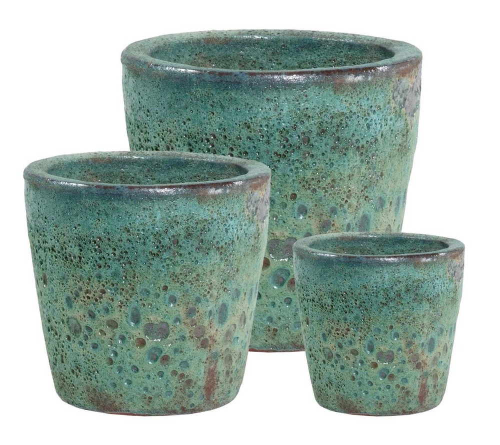 Dieses außergewöhnliche Set aus drei stilvollen Vasen aus glasiertem Terrakotta bringt mediterranes Flair und natürliche Eleganz in Ihren Außenbereich. Jede Vase ist in einem ansprechenden Türkiston gehalten, der je nach Lichteinfall unterschiedlich wirkt und Ihrem Garten, Ihrer Terrasse oder Ihrem Balkon eine lebendige, zugleich harmonische Farbstimmung verleiht. Die glänzende Glasur betont die geschwungenen Formen und sorgt für ein hochwertiges Erscheinungsbild, das sich hervorragend mit unterschiedlichen Outdoor-Stilen kombinieren lässt. Ein besonderes Merkmal dieses Sets sind die bewusst in Kauf genommenen Farbabweichungen, Nuancen und kleinen Unvollkommenheiten. Diese entstehen durch den handwerklichen Herstellungsprozess und machen jede Vase zu einem einzigartigen Unikat. Statt als Makel gelten sie als charaktervolle Zeichen authentischer Handarbeit und verleihen dem Ensemble eine individuelle, naturverbundene Ausstrahlung. Alle drei Vasen verfügen über ein Loch an der Unterseite, das eine optimale Drainage ermöglicht – ideal für den Einsatz als Pflanzgefäß im Außenbereich. So wird verhindert, dass sich überschüssiges Wasser staut, während Ihre Pflanzen dennoch von stabilen und dekorativen Töpfen profitieren. Dank ihrer robusten Terrakotta-Qualität sind die Vasen langlebig und bestens für verschiedene Wetterbedingungen geeignet. Das Set umfasst drei unterschiedlich große Vasen, sodass sich eine vielseitige und dynamische Dekoration ergibt. Die große Vase überzeugt mit Maßen von ca. 30 x 28 x 30 cm, die mittlere misst ca. 23 x 23 x 23 cm und die kleine Vase rundet das Ensemble mit ca. 16 x 16 x 16 cm ab. Durch diese Größenvielfalt lassen sich attraktive Arrangements gestalten – ob gruppiert oder einzeln platziert. Ob als dekoratives Highlight im Garten, als stilvolle Ergänzung auf der Terrasse oder als charmantes Pflanzengefäß mit mediterranem Akzent – dieses dreiteilige Vasen-Set verbindet Natürlichkeit mit künstlerischem Charakter und macht jeden Außenbereich zu etwas Besonderem.