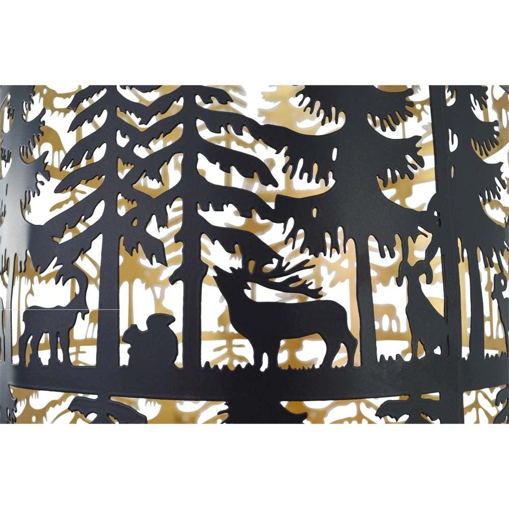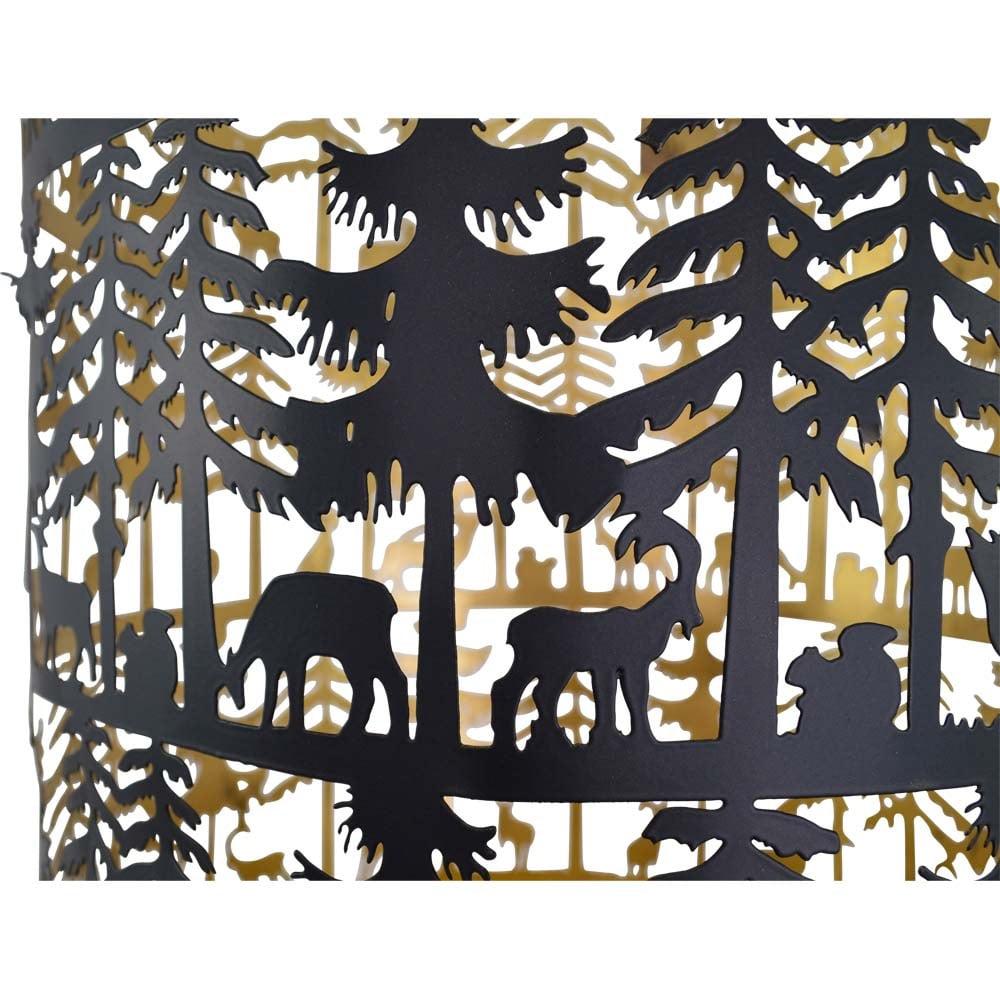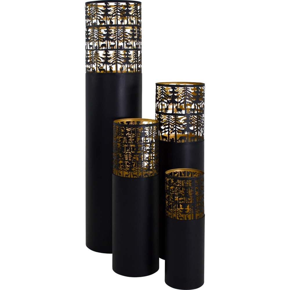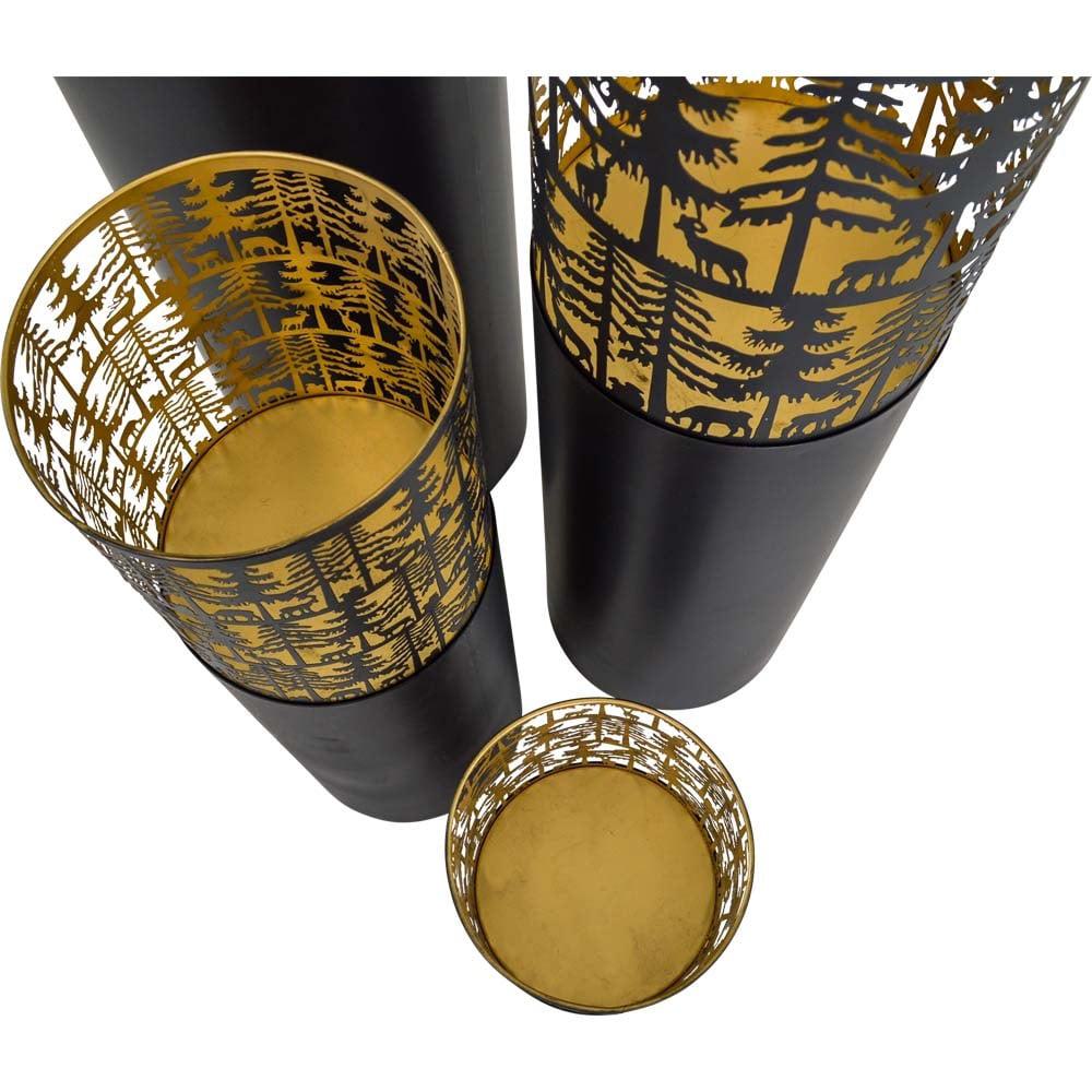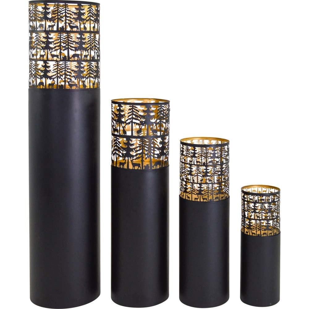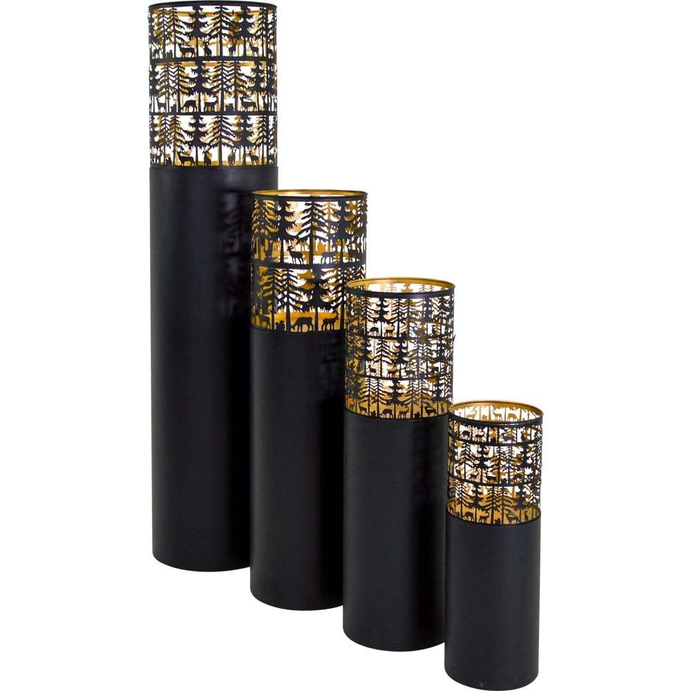 Verleihen Sie Ihrem Zuhause, Garten oder Ihrer Terrasse eine besondere, stimmungsvolle Atmosphäre mit diesem eleganten Set aus vier Windlichtsäulen. Jede Säule ist aus robustem Stahl gefertigt und überzeugt durch hochwertige Verarbeitung, Langlebigkeit und ein außergewöhnliches Design, das Funktionalität und Dekoration perfekt miteinander verbindet. Das Äußere der Säulen besticht durch ein edles schwarzes Finish, das elegant wirkt und sich harmonisch in unterschiedlichste Einrichtungsstile einfügt. Im Inneren sorgt ein warmes goldenes Finish für ein einladendes Leuchten, sobald Sie Kerzen oder LED-Lichter platzieren. Das Zusammenspiel von Schwarz außen und Gold innen erzeugt eine besonders stilvolle Lichtwirkung, die jeden Raum oder Gartenbereich in sanftes, gemütliches Licht taucht. Die Säulen sind mit einem liebevoll gestalteten Walddesign verziert, das filigrane Bäume, Pflanzen und verschiedene Waldtiere zeigt. Diese detailreiche Ornamentik bringt die Schönheit der Natur in Ihr Zuhause und schafft ein zauberhaftes, beruhigendes Ambiente – ideal für entspannte Abende, stimmungsvolle Dekoration oder als Highlight bei besonderen Anlässen. Das Set umfasst vier Säulen in verschiedenen Größen, wodurch Sie vielfältige Gestaltungsmöglichkeiten haben. Sie können die Säulen einzeln oder als Ensemble arrangieren, um harmonische Lichtinseln zu schaffen, interessante Höhenakzente zu setzen oder stimmungsvolle Übergänge in Ihrem Wohn- oder Außenbereich zu gestalten. Dieses Set aus Windlichtsäulen vereint hochwertige Materialien, künstlerisches Design und stimmungsvolle Funktionalität. Es ist nicht nur eine dekorative Bereicherung für Ihr Zuhause, sondern auch ein stilvolles Statement für Individualität und Naturverbundenheit. Schaffen Sie mit diesen Windlichtsäulen warme, gemütliche Momente und eine bezaubernde Atmosphäre, die Ihre Räume und Ihren Garten in ein stimmungsvolles Licht taucht.