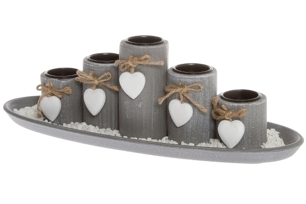 Der 5er Teelichthalter Tabea mit Tablett ist aus MDF und in Farbe Grau. Die fünf unterschiedlich hohen Teelichthalter und das Tablett sind in moderner Steinoptik gehalten. Romantische Herz-Applikationen und Schleifen aus Spitze bringen romantischen Landhausstil in ihr Zuhause