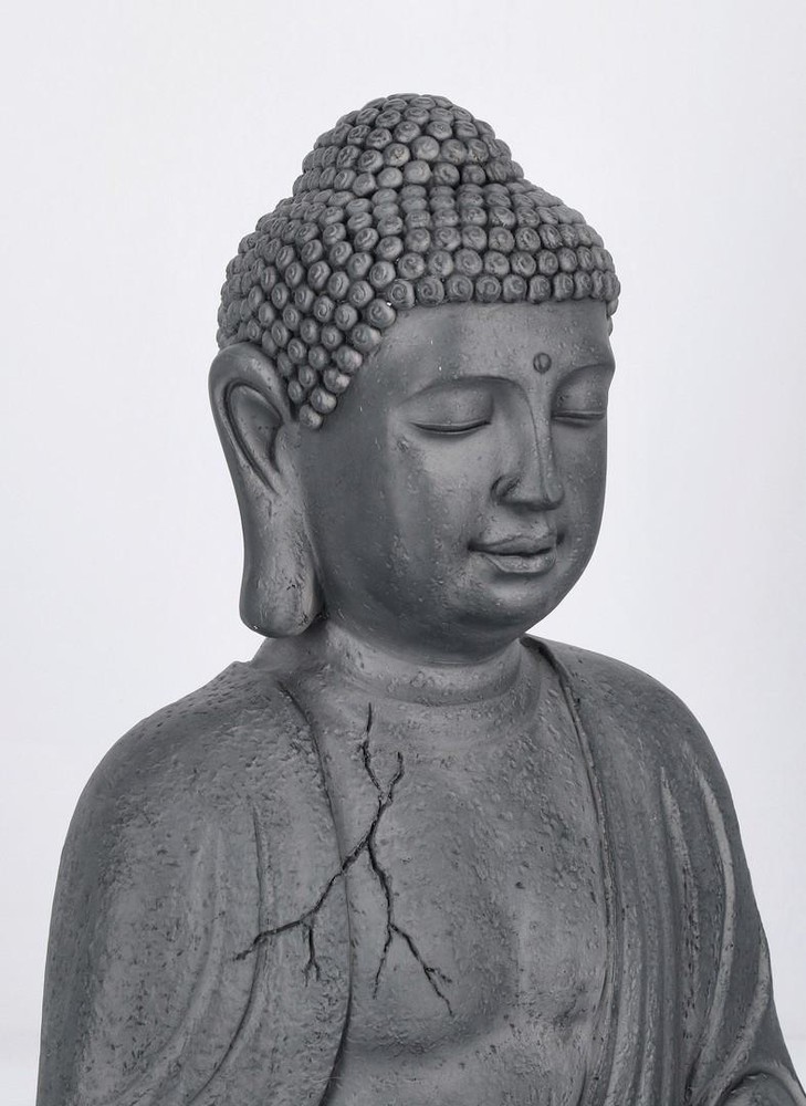 Diese beeindruckende Buddha-Statue aus Glasfaser und Tonfaser vereint künstlerische Eleganz mit robuster Handwerkskunst und ist ideal für den Einsatz im Außenbereich geeignet. Die graue Farbgebung verleiht der Statue eine ruhige, harmonische Ausstrahlung, die sich nahtlos in Gärten, Terrassen oder meditative Bereiche einfügt. Durch ihre sorgfältige Verarbeitung wirkt die Statue sowohl kraftvoll als auch anmutig und schafft eine friedvolle, inspirierende Atmosphäre. Besondere Akzente setzen die gezielt eingebrachten Risse auf der Oberfläche. Diese wurden bewusst gestaltet, um dem Kunstwerk einen antiken, gelebten Charakter zu verleihen. Sie vermitteln den Eindruck jahrhundertealter Tradition und verleihen der Statue eine authentische, zeitlose Ausstrahlung, die jeden Raum oder Außenbereich bereichert. Mit den Maßen von ca. 41 x 71 x 52 cm (Breite x Höhe x Tiefe) besitzt die Statue eine imposante Präsenz, ohne übermäßig dominant zu wirken. Sie kann sowohl als zentrales Dekorationselement als auch harmonisch in bestehende Arrangements integriert werden, um ruhige, meditative Akzente zu setzen. Die Kombination aus hochwertigen Materialien, sorgfältiger Handarbeit und einem durchdachten Design macht diese Buddha-Statue zu einem langlebigen, stilvollen Objekt. Sie verbindet künstlerische Ausdruckskraft mit Funktionalität und verleiht Ihrem Außenbereich oder Innenraum eine spirituelle, friedvolle Note.