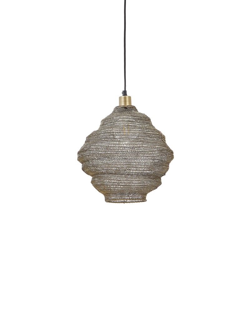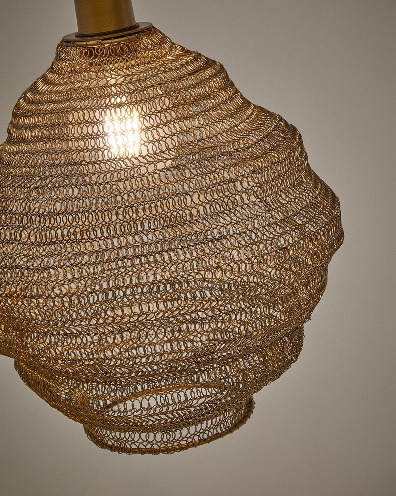Diese stilvolle Deckenlampe vereint modernes Design mit einem Hauch luxuriöser Eleganz und wird zum strahlenden Mittelpunkt in Ihrem Zuhause. Gefertigt aus robustem Eisen überzeugt sie durch ihre hochwertige Verarbeitung sowie ihre langlebige Qualität. Die edle, goldene Oberfläche verleiht der Leuchte eine warme Ausstrahlung und sorgt für ein stimmungsvolles Lichtambiente. Ein besonderes Highlight ist das kunstvolle Netz-Design. Die filigrane Struktur umschließt das Leuchtmittel auf dekorative Weise und erzeugt faszinierende Licht- und Schattenspiele an Ihren Wänden und an der Decke. So schaffen Sie im Handumdrehen eine wohnliche, einladende Atmosphäre – ideal für Ihr Wohnzimmer, Esszimmer, Schlafzimmer oder Ihren Eingangsbereich. Die goldenen Details unterstreichen den eleganten Charakter der Lampe und setzen stilvolle Akzente, ohne aufdringlich zu wirken. Durch die gelungene Kombination aus industriellem Material und edler Farbgebung fügt sich diese Deckenleuchte harmonisch in moderne, klassische oder glamouröse Einrichtungskonzepte ein. Mit ihren Maßen von ca. 30 x 35 x 30 cm (Breite x Höhe x Tiefe) bietet Ihnen die Lampe eine kompakte, aber dennoch präsente Größe. Sie eignet sich hervorragend als einzelnes Design-Statement oder in Kombination mit weiteren Leuchten für ein stimmiges Gesamtbild. Diese Deckenlampe ist für Sie nicht nur eine Lichtquelle, sondern zugleich ein dekoratives Gestaltungselement, das Funktionalität und Ästhetik auf elegante Weise miteinander verbindet.