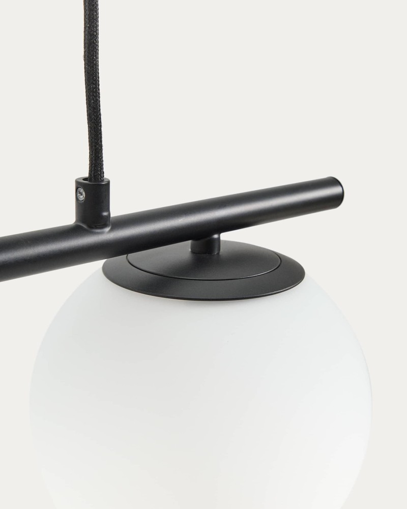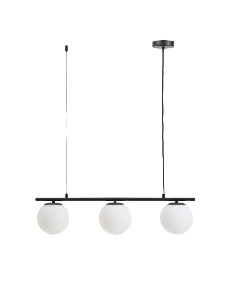 Setzen Sie eindrucksvolle Akzente in Ihrem Wohnraum mit dieser Deckenleuchte aus robustem Stahl mit elegantem schwarzen Finish. Die klare Linienführung in Kombination mit den drei kugelförmigen, mattweißen Glasschirmen verleiht der Leuchte eine moderne, zugleich zeitlose Ausstrahlung, die sich harmonisch in unterschiedlichste Einrichtungsstile einfügt. Die drei Schirme sind so positioniert, dass sie das Licht gleichmäßig im Raum verteilen und dabei ein sanftes, blendfreies Ambiente schaffen. Das mattierte Glas sorgt für eine warme, angenehme Beleuchtung, die sowohl für Wohnzimmer, Essbereich, Flur oder Büro geeignet ist. Durch die klare Formensprache wirkt die Leuchte gleichzeitig leicht, elegant und dekorativ – ein echter Blickfang, der jedem Raum Charakter verleiht. Mit den großzügigen Maßen von ca. 72 × 119 × 15 cm (Breite × Höhe × Tiefe) entfaltet die Leuchte eine starke Präsenz, ohne überladen zu wirken. Die Kombination aus stabiler Stahlstruktur und hochwertigen Glaselementen garantiert Langlebigkeit und Funktionalität, während das schwarze Finish der Lampe eine zeitlose, elegante Ästhetik verleiht, die sich leicht mit anderen Einrichtungselementen kombinieren lässt. Diese Deckenleuchte ist ideal für alle, die Design, Qualität und angenehmes Licht miteinander verbinden möchten. Sie vereint ästhetische Eleganz, funktionale Lichtführung und langlebige Materialien in einem durchdachten Konzept – perfekt, um Ihren Wohnraum stilvoll zu inszenieren und eine einladende Atmosphäre zu schaffen.