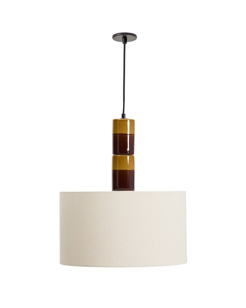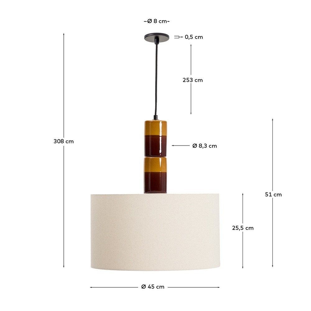 Bringen Sie warme Eleganz und stilvolles Design in Ihre Räume mit dieser hochwertigen Deckenleuchte, die Funktionalität und Ästhetik auf besondere Weise vereint. Der Lampenkorpus aus glasierter Keramik besticht durch eine harmonische Kombination aus Senfgelb und Braun und setzt einen lebendigen, zugleich eleganten Akzent in jedem Raum. Die glänzende Oberfläche reflektiert das Licht sanft und sorgt für eine einladende Atmosphäre. Der Lampenschirm aus hochwertiger weißer Baumwolle garantiert ein gleichmäßiges, sanftes Licht, das für gemütliche Stimmung und angenehme Beleuchtung sorgt. Dank der neigbaren Funktion können Sie den Lichtkegel individuell ausrichten und so die Lichtwirkung gezielt auf bestimmte Bereiche lenken – ideal für Esstisch, Wohnzimmer oder Flur. Besondere Aufmerksamkeit verdient das Kabel, das mit weichem Stoff ummantelt ist, sowie die schwarze Rosette, die das elegante Gesamtbild abrunden und der Leuchte eine hochwertige, durchdachte Detailgestaltung verleihen. Die Höhenverstellbarkeit der Deckenleuchte bietet zusätzlich maximale Flexibilität bei der Platzierung und ermöglicht eine perfekte Anpassung an unterschiedliche Raumhöhen und Einrichtungssituationen. Mit großzügigen Maßen von ca. 45 x 308 x 45 cm sorgt die Deckenleuchte für eine eindrucksvolle Präsenz, ohne überladen zu wirken. Sie verbindet hochwertige Materialien, sorgfältige Verarbeitung und funktionale Vielseitigkeit mit zeitloser Ästhetik. So wird diese Deckenleuchte zum stilvollen Highlight, das Ihren Räumen eine warme, einladende Lichtstimmung verleiht und gleichzeitig als dekoratives Element Ihre Einrichtung aufwertet.