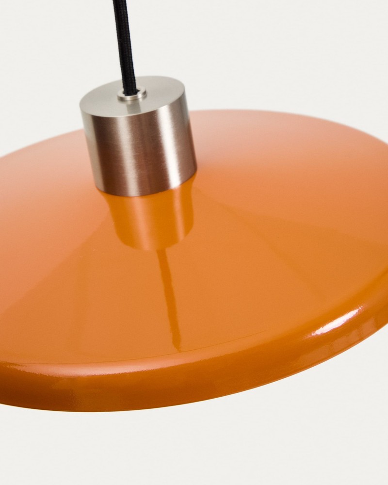 Diese markante Deckenleuchte setzt stilvolle Akzente und vereint modernes Design mit funktionaler Eleganz. Der Schirm aus gebürstetem Stahl in leuchtendem Orange sorgt für einen warmen, einladenden Lichteffekt und wird so zum Blickfang in jedem Raum – ob über dem Esstisch, in der Küche oder im Wohnbereich. Die Kombination aus kräftiger Farbe und hochwertiger Metalloptik verleiht Ihrem Interieur eine zeitgemäße, lebendige Note. Das Kabel ist mit weichem schwarzem Stoff ummantelt, was nicht nur die Optik veredelt, sondern auch für eine angenehme Haptik sorgt. Silberne Details am Schirm und an den Aufhängungselementen runden das Design harmonisch ab und setzen elegante Akzente, die dem modernen Industrie- oder Loftstil eine besondere Raffinesse verleihen. Die großzügige Kabellänge von 249 cm ermöglicht eine flexible Platzierung der Leuchte in unterschiedlich hohen Räumen. So können Sie die Deckenleuchte perfekt an Ihre räumlichen Gegebenheiten anpassen, sei es über einem großen Esstisch, in einem offenen Wohnbereich oder in einem Durchgangsbereich. Mit Maßen von ca. 27 cm Breite, 260 cm Höhe und 27 cm Tiefe kombiniert die Leuchte schlanke Proportionen mit beeindruckender Präsenz. Sie sorgt für eine optimale Lichtverteilung und setzt zugleich ein ausdrucksstarkes, dekoratives Statement. Diese Deckenleuchte ist die ideale Wahl für alle, die modernes Design, hochwertige Materialien und eine individuelle Farbnote in einem funktionalen Beleuchtungskonzept verbinden möchten. Sie verleiht Ihrem Zuhause Persönlichkeit, Wärme und einen Hauch von Exklusivität.