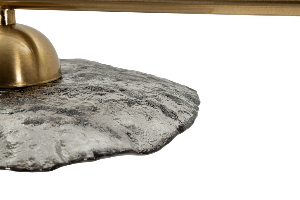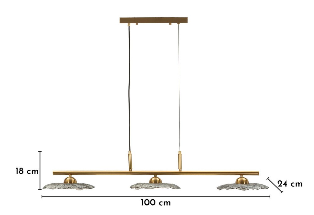 Diese Deckenleuchte mit drei Lichtquellen vereint modernes Design mit edlen Materialien und setzt in jedem Raum einen stilvollen Akzent. Die Struktur aus Metall mit goldenem Finish strahlt Eleganz aus und bildet den perfekten Rahmen für die drei Lampenschirme. Diese sind aus Glas in smoked Gray gefertigt und besitzen eine runde, organische Form, die das Licht sanft streut und eine warme, atmosphärische Beleuchtung erzeugt. Die Kombination aus goldfarbenem Metall und rauchgrauem Glas schafft einen harmonischen Kontrast zwischen luxuriösem Glanz und subtiler Zurückhaltung. Die organischen Formen der Lampenschirme verleihen der Leuchte einen fließenden, modernen Charakter, der sowohl minimalistische als auch klassisch inspirierte Einrichtungen bereichert. Mit den Maßen von ca. 100 x 18 x 24 cm (Breite x Höhe x Tiefe) wirkt die Leuchte präsent, ohne den Raum zu dominieren, und sorgt für eine gleichmäßige Ausleuchtung. Sie verbindet hochwertige Materialien, durchdachtes Design und stimmungsvolles Licht und wird so zum eleganten Highlight in Wohn- oder Essbereichen, Fluren oder über Kücheninseln.