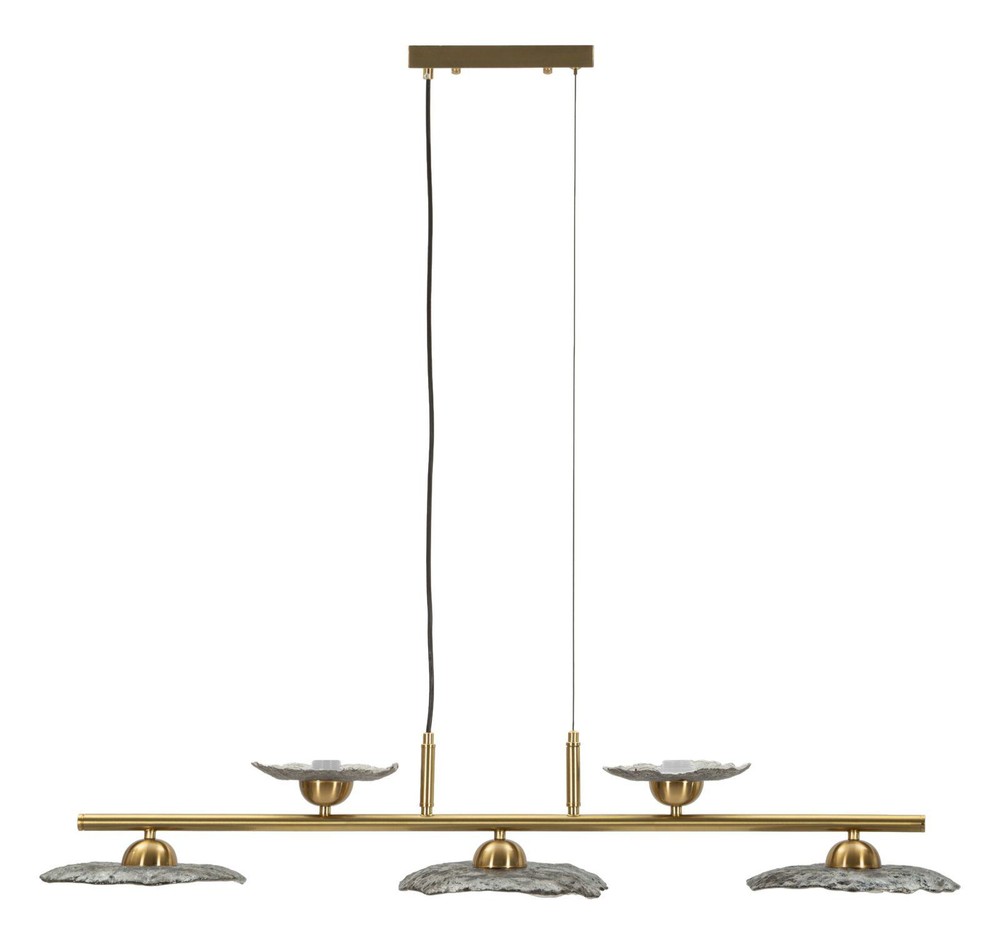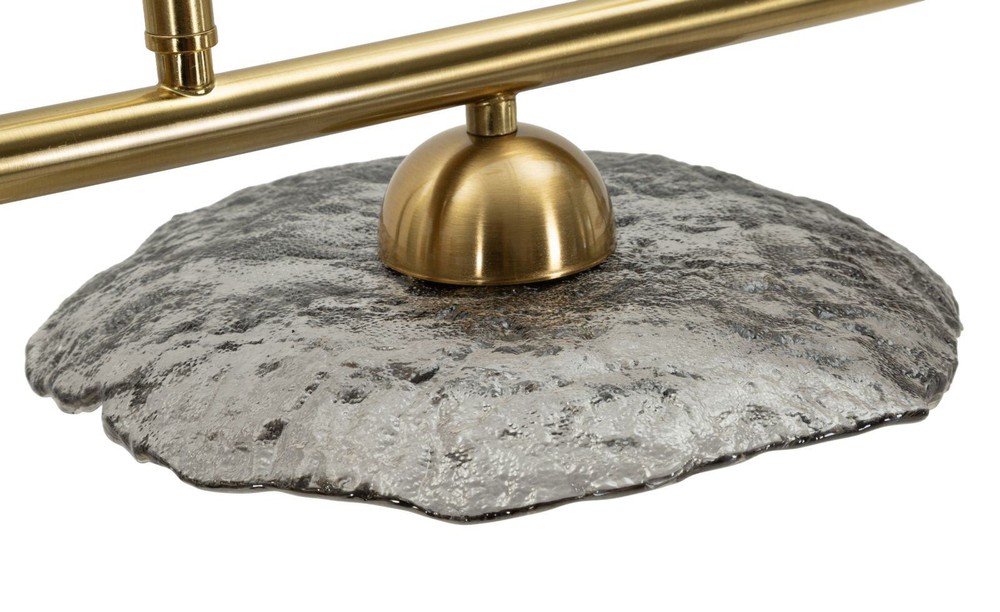 Diese Deckenleuchte vereint modernes Design mit kunstvoller Dynamik und setzt in jedem Raum ein stilvolles Highlight. Die Struktur aus Metall mit goldenem Finish strahlt Eleganz und Wärme aus und bildet die perfekte Basis für die dekorativen Leuchtelemente. Die Lampenschirme aus strukturiertem Glas in smoked grey bestechen durch ihre runde, organische Form und erzeugen ein sanft gestreutes, atmosphärisches Licht, das eine einladende Stimmung schafft. Besonders charakteristisch ist die Anordnung der Lichtquellen: Auf dem Metallrahmen befinden sich drei Lampenschirme nach unten und zwei nach oben, sodass die Leuchte sowohl direktes als auch indirektes Licht bietet. Dieses abwechselnde Design verleiht der Lampe eine skulpturale Wirkung und sorgt dafür, dass sie aus jedem Blickwinkel fasziniert. Mit den Maßen von ca. 100 x 18 x 24 cm (Breite x Höhe x Tiefe) ist die Deckenleuchte großzügig dimensioniert, wirkt aber dank der schlanken Struktur leicht und elegant. Sie eignet sich ideal, um Essbereiche, Wohnzimmer oder andere zentrale Räume stilvoll zu beleuchten und gleichzeitig als dekoratives Statement zu dienen.