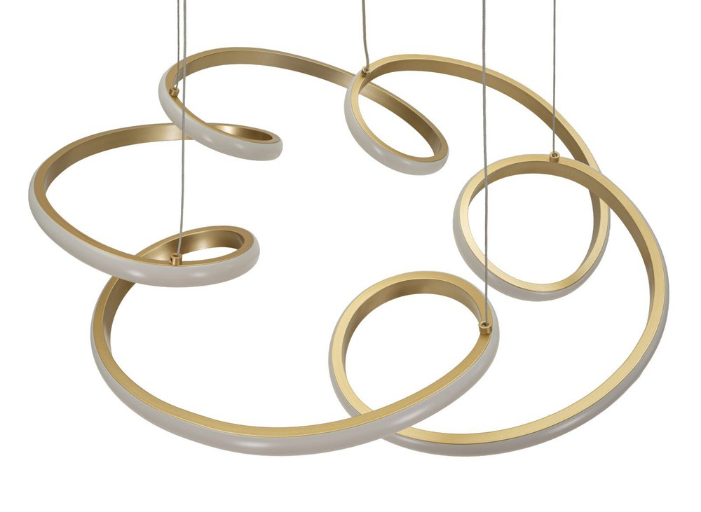 Diese Hängeleuchte überzeugt mit einem modernen, dynamischen Design und vereint stilvolle Ästhetik mit innovativer Lichttechnik. Gefertigt aus Aluminium, Eisen und PVC, besticht die Leuchte durch ihre fließende, schwungvolle Form, die dem Raum eine elegante und gleichzeitig lebendige Ausstrahlung verleiht. Die Kombination aus mattem Weiß und goldfarbenen Akzenten sorgt für einen harmonischen Kontrast und unterstreicht den zeitgemäßen Charakter der Leuchte. Die integrierte LED-Beleuchtung ist dimmbar und bietet drei verschiedene Lichttemperaturen, sodass sich die Beleuchtung flexibel an unterschiedliche Stimmungen und Anforderungen anpassen lässt – von warmem, gemütlichem Licht bis hin zu klarer, funktionaler Ausleuchtung. Dadurch eignet sich die Lampe ideal, um sowohl eine angenehme Atmosphäre zu schaffen als auch gezielte Lichtakzente zu setzen. Mit ihren Maßen von ca. 55 x 120 x 55 cm (Breite x Höhe x Tiefe) entfaltet die Hängeleuchte eine elegante Präsenz, ohne den Raum zu überladen. Die geschwungene Form und das moderne Farbspiel machen sie zu einem dekorativen Highlight, das Design, Funktionalität und moderne Beleuchtungstechnologie auf stilvolle Weise miteinander verbindet.