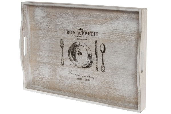Das Tablett Harro ist aus MDF in Farbe Weiß Antik.. Es hat stabile Tragegriffe an den Seiten. Die aufgedruckte Grafik und Redewendung Bon Appetit verleihen diesem Tablett den Shabby Chic Look. Ein sehr praktisches und dekoratives Accesoire für ihr Zuhause.