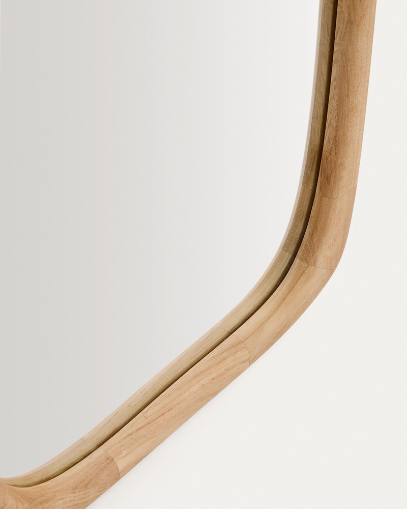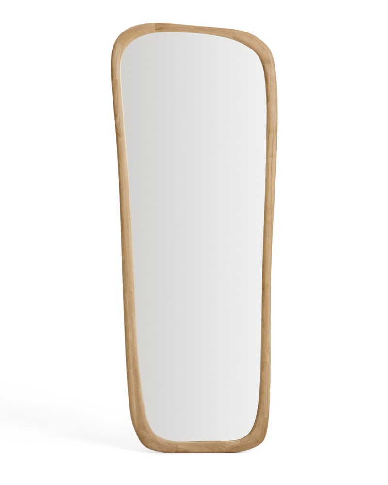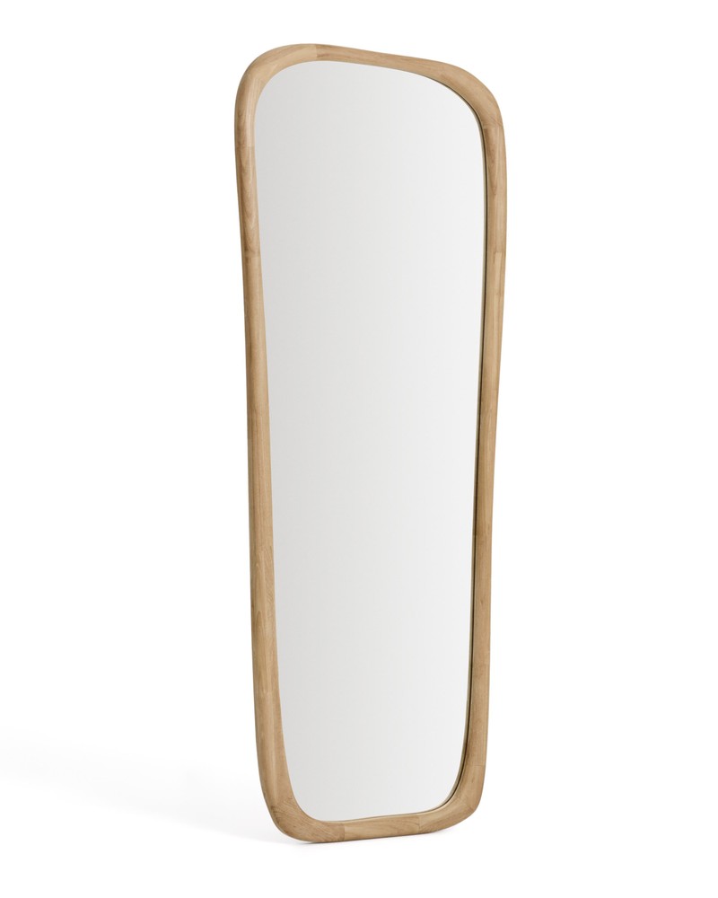 Dieser außergewöhnliche Spiegel vereint zeitlose Eleganz mit natürlicher Schönheit und bringt einen Hauch von organischem Design in Ihr Zuhause. Der Rahmen aus Teakholz mit natürlichem Finish besticht durch warme, lebendige Maserungen und eine geschmeidige Haptik, die jedes Exemplar zu einem Unikat macht. Die organische Form des Rahmens verleiht dem Spiegel eine sanfte, fließende Ästhetik, die Räume optisch erweitert und gleichzeitig einen stilvollen Akzent setzt. Die Rückseite des Spiegels besteht aus robustem Sperrholz und ist mit einem stabilen Aufhänger ausgestattet, der eine sichere Montage an der Wand ermöglicht. So lässt sich der Spiegel mühelos in verschiedenen Räumen positionieren – ob im Flur, Wohnzimmer oder Schlafzimmer. Mit großzügigen Maßen von ca. 61 × 158 × 3,2 cm (Breite × Höhe × Tiefe) ist der Spiegel nicht nur praktisch, sondern auch ein beeindruckendes Dekorationselement. Er eignet sich perfekt, um Licht in den Raum zu reflektieren, das Raumgefühl zu vergrößern und gleichzeitig die natürliche Wärme des Teakholzes zur Geltung zu bringen.