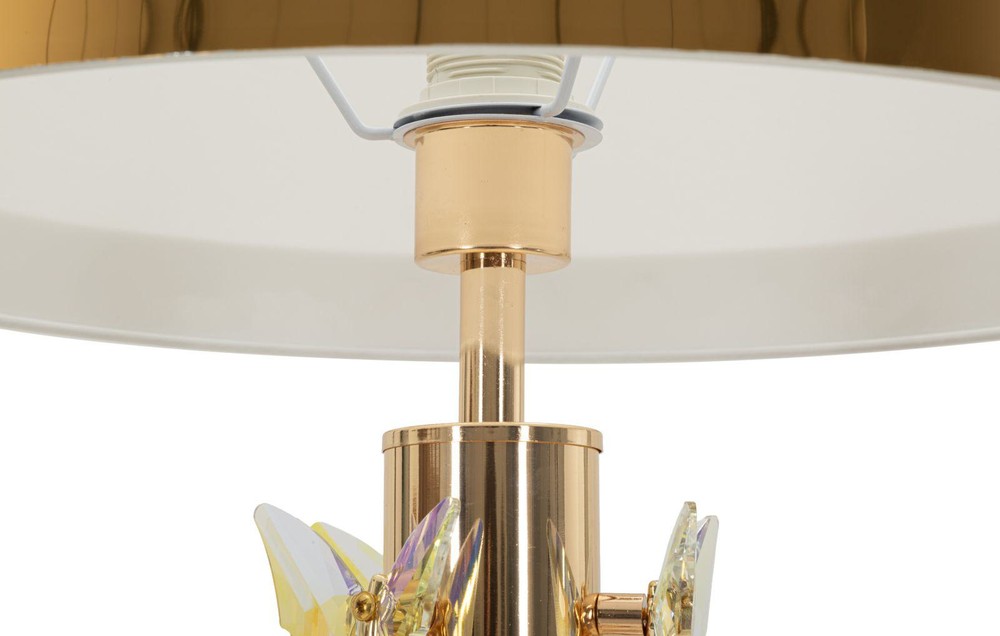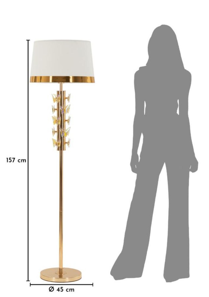Diese Stehlampe vereint elegantes Design mit künstlerischen Details und wird zum stilvollen Blickfang in jedem Raum. Der runde Sockel und der schlanke Metallstab mit goldenem Finish verleihen der Lampe eine edle, moderne Ausstrahlung, während die verzierenden Schmetterlinge aus goldenem Glas für ein verspieltes, dekoratives Highlight sorgen und dem Design eine leichte, fast schwebende Dynamik verleihen. Der weiße Lampenschirm aus Stoff mit feiner goldener Kante rundet das Erscheinungsbild harmonisch ab und sorgt für ein weiches, gleichmäßiges Licht, das eine warme und einladende Atmosphäre schafft. Die Kombination aus glänzendem Metall, zarten Glaselementen und dem sanften Licht des Schirms macht die Lampe zu einem dekorativen Statement, das Eleganz und Wohnlichkeit perfekt vereint. Mit den Maßen von ca. 45 x 157 x 45 cm (Breite x Höhe x Tiefe) ist die Stehlampe hoch genug, um in jedem Raum Präsenz zu zeigen, ohne zu dominant zu wirken. Sie verbindet ästhetisches Design, hochwertige Materialien und stimmungsvolles Licht auf harmonische Weise und setzt überall ein elegantes und künstlerisches Highlight.