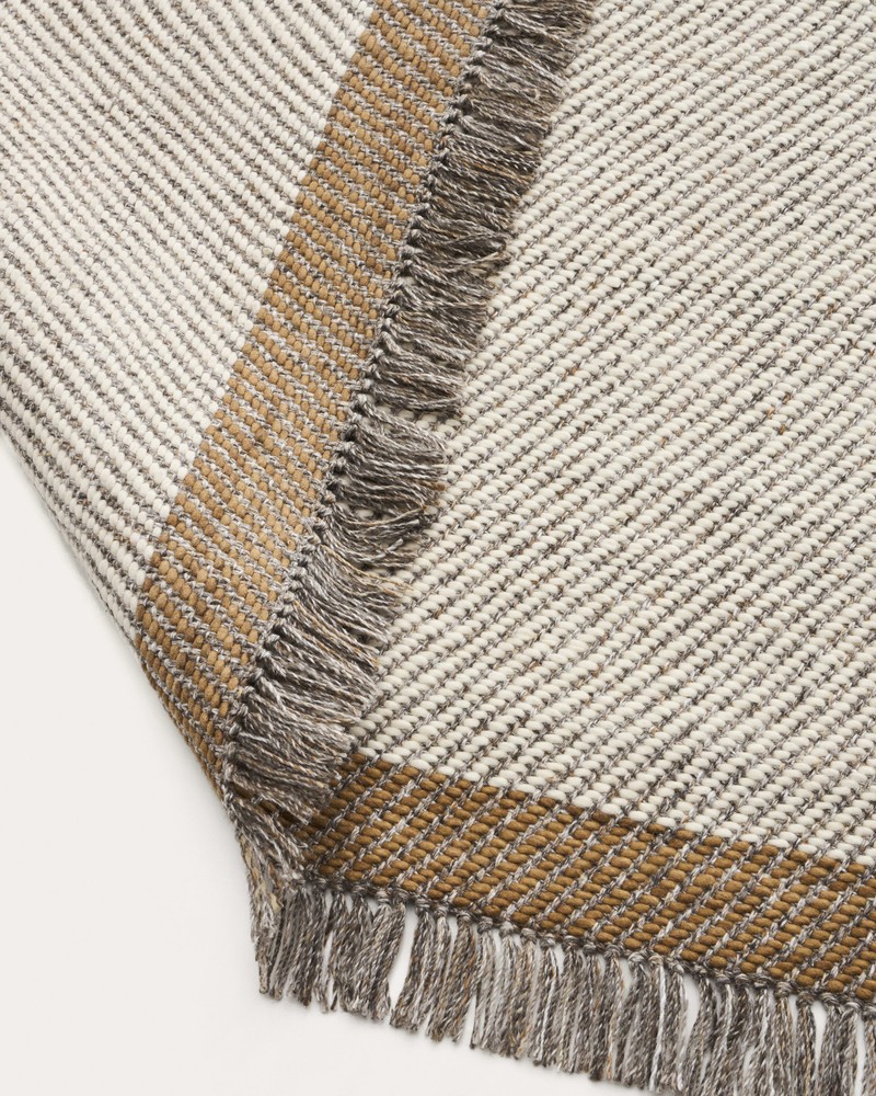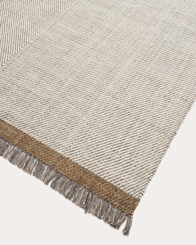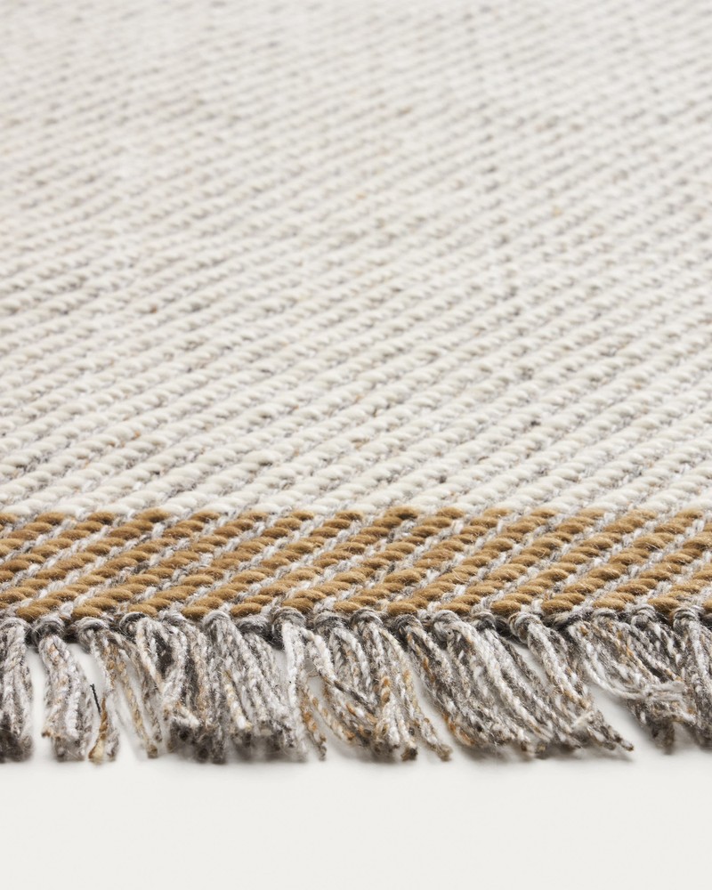 Bringen Sie Wärme, Stil und Struktur in Ihr Zuhause mit diesem handgewebten Wollteppich aus hochwertigem Wollmischgewebe. Das dezente Jacquard-Fischgrätmuster in Beige verleiht dem Teppich eine zeitlose Ästhetik, die sowohl klassische als auch moderne Einrichtung perfekt ergänzt. Jeder Teppich wird handgefertigt, wodurch leichte Abweichungen im Muster und in der Struktur entstehen – jedes Stück ist somit ein einzigartiges Unikat. Diese handwerkliche Verarbeitung sorgt nicht nur für optische Besonderheiten, sondern auch für eine besonders angenehme Haptik und ein wohnliches Gefühl unter den Füßen. Die flache Webart mit einer Höhe von ca. 1 cm macht den Teppich besonders pflegeleicht und vielseitig einsetzbar. Ob im Wohnzimmer, Schlafzimmer oder Arbeitsbereich – er definiert Räume elegant, schafft gemütliche Akzente und vermittelt natürliche Behaglichkeit. Durch die hochwertige Wollmischung kombiniert der Teppich Komfort, Langlebigkeit und eine angenehme Wärme. Mit den Maßen von ca. 230 × 160 cm eignet sich der Teppich ideal für kleinere bis mittelgroße Wohnbereiche und bringt harmonische Proportionen in Ihr Raumkonzept.