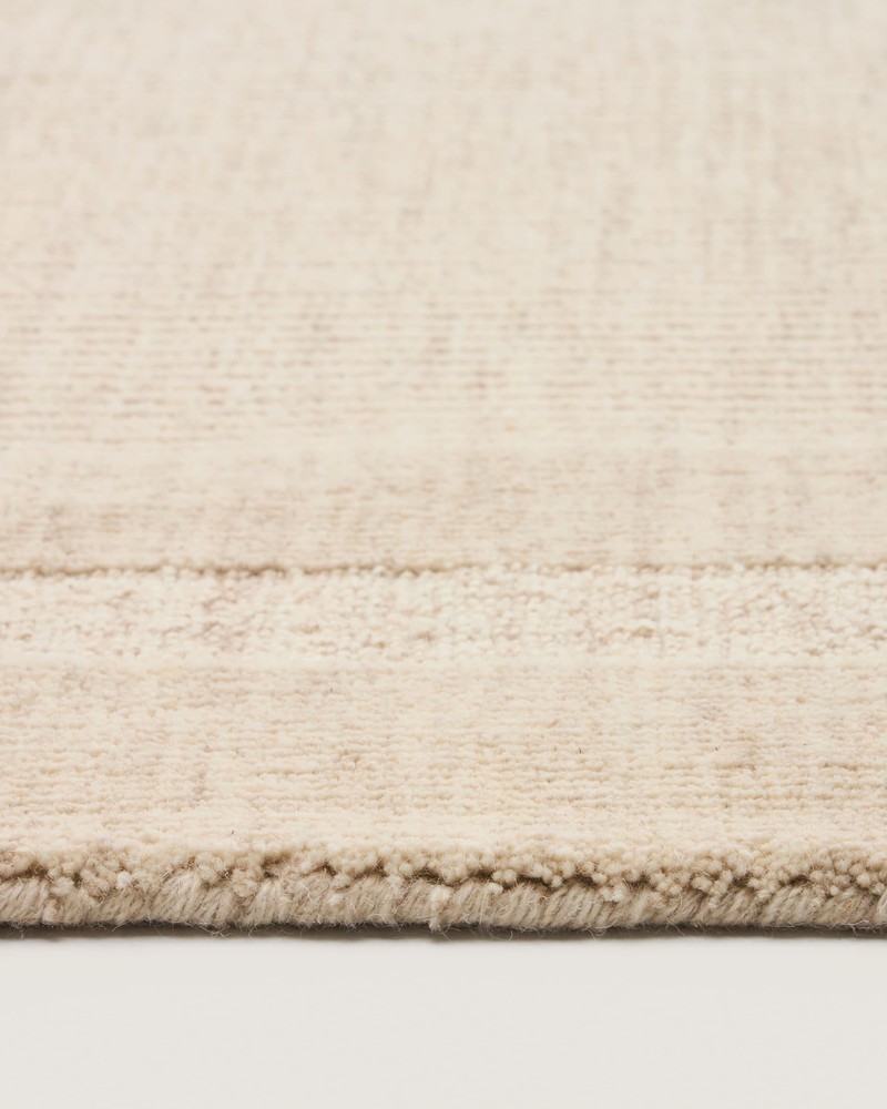 Dieser hochwertige Teppich vereint traditionelle Handwerkskunst mit modernem Design und bringt warme, natürliche Eleganz in jeden Wohnraum. Mit seinem dezenten Jacquard-Streifenmuster in sanften Beigetönen schafft er eine stilvolle, ruhige Atmosphäre und lässt sich mühelos in unterschiedlichste Einrichtungsstile integrieren – von skandinavisch bis klassisch-modern. Gefertigt aus 100 % reiner Wolle, überzeugt der Teppich durch seine angenehme Haptik, natürliche Wärmeisolierung und Langlebigkeit. Wolle ist von Natur aus robust, schmutzabweisend und temperaturregulierend – ideal für Wohn- und Schlafräume, in denen Komfort und Qualität im Mittelpunkt stehen. Jedes Stück wird auf traditionelle Weise von Hand gewebt, wodurch feine Unregelmäßigkeiten und subtile Farbnuancen entstehen, die jeden Teppich zu einem Unikat machen. Diese handwerklichen Variationen sind Ausdruck echter Authentizität und verleihen dem Teppich seinen besonderen Charme. Mit seinen großzügigen Maßen von ca. 300 × 200 × 1 cm ist er perfekt geeignet, um große Räume zu strukturieren oder stilvolle Akzente unter Sofas, Esstischen oder Betten zu setzen. Die flache Webstruktur sorgt dabei für ein angenehmes Laufgefühl und macht den Teppich gleichzeitig pflegeleicht und alltagstauglich.