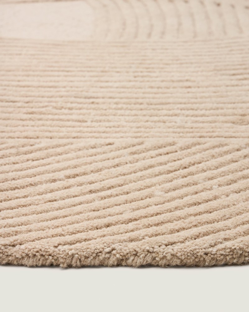 Bringe mit diesem Teppich aus 100 % Wolle Wärme, Textur und stilvolle Natürlichkeit in dein Zuhause. Sein sanftes Beigetön und die organische, fließende Form schaffen eine harmonische, einladende Atmosphäre und setzen gleichzeitig einen modernen, ästhetischen Akzent in jedem Raum. Das Jacquard-Muster unterstreicht die hochwertige Handwerkskunst und verleiht dem Teppich eine subtile, elegante Struktur, die zugleich dekorativ und zeitlos ist. Jedes Exemplar wird manuell auf traditionellen Handwebstühlen gefertigt, wodurch sich leichte Variationen in Farbe, Muster und Struktur ergeben. Diese feinen Unterschiede machen jeden Teppich zu einem einzigartigen Kunstwerk, das Individualität und Authentizität ausstrahlt. Die natürliche Wollfaser sorgt zudem für eine warme Haptik, angenehme Trittdämpfung und eine langlebige Qualität, die sich im Alltag bewährt. Mit seinen Maßen von ca. 230 × 160 × 1 cm bietet der Teppich ausreichend Fläche, um Wohn- oder Schlafbereiche harmonisch zu strukturieren oder als elegantes Highlight unter Möbeln zu fungieren. Die flache, dichte Webstruktur macht ihn pflegeleicht, trittsicher und gleichzeitig komfortabel für barfüßiges Gehen.