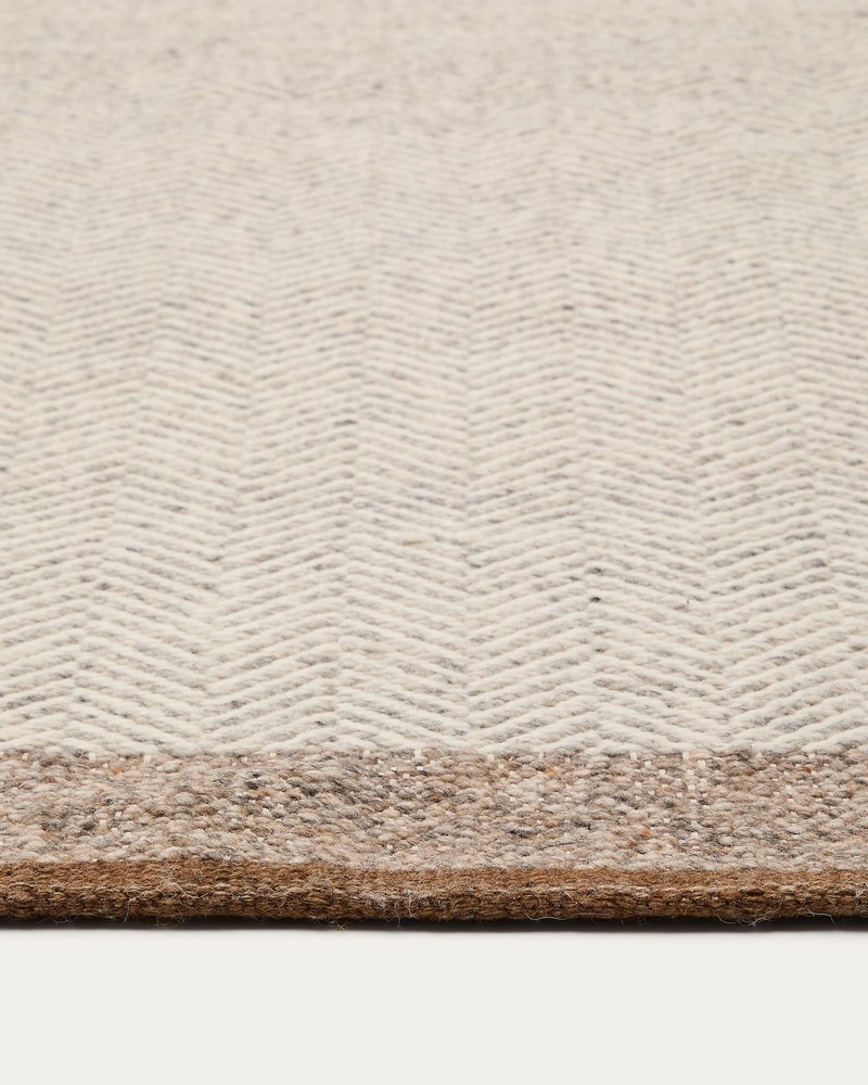 Entdecken Sie diesen exquisiten Jacquard-Wollteppich mit edlem Fischgrätenmuster in einem warmen Beigeton – ein zeitloses Design, das jedem Raum eine elegante Note verleiht. Jeder Teppich wird mit viel Liebe zum Detail manuell auf traditionellen Handwebstühlen gefertigt, wodurch jedes Stück ein Unikat ist, das seine eigenen, einzigartigen Farbtöne und Texturen präsentiert. Hergestellt aus 85 % hochwertiger Wolle und 15 % Baumwolle, vereint dieser Teppich nicht nur Stil, sondern auch Funktionalität: Wolle ist hypoallergen und bietet eine hervorragende Isolation, die für ein angenehmes Raumklima sorgt. Mit großzügigen Abmessungen von ca. 300 x 200 cm und einer Höhe von ca. 1 cm wird dieser Teppich zum Blickfang in Ihrem Zuhause. Gönnen Sie sich das Besondere – ein Stück Natur und Handwerkskunst, das Wärme und Behaglichkeit in jeden Raum bringt.