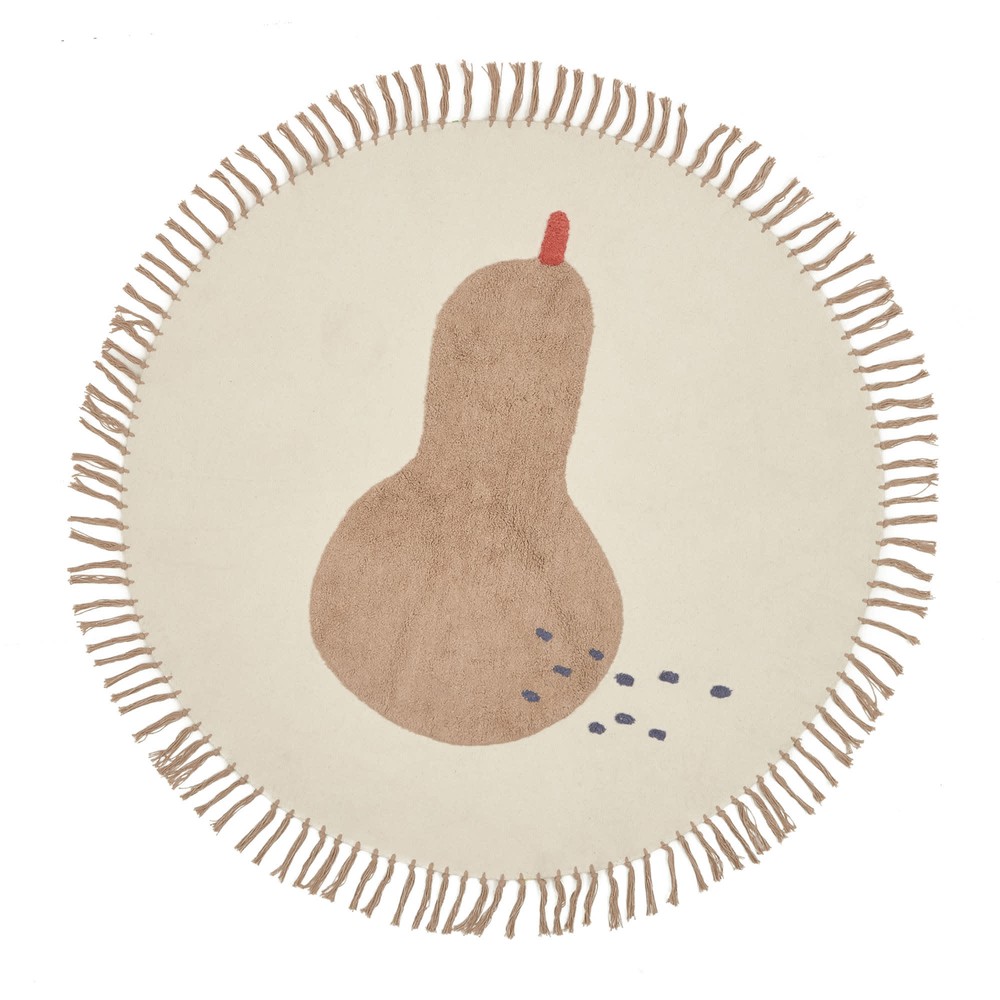 Dieser runde Teppich aus 100 % Baumwolle vereint natürliche Materialien, handwerkliche Details und verspieltes Design und wird zum stilvollen Blickfang in Ihrem Wohnraum. In einem warmen Beigeton gehalten, bildet er die perfekte neutrale Basis, während das dekorative Birnen-Design in Braun charmante Akzente setzt und dem Teppich eine freundliche, verspielte Note verleiht. Die Reliefstruktur sorgt für zusätzliche Tiefe und taktile Vielfalt, sodass der Teppich nicht nur optisch, sondern auch haptisch überzeugt. Die weiche Oberfläche macht ihn besonders angenehm für Barfußfüße, Sitzgelegenheiten oder Spielbereiche und schafft eine einladende, gemütliche Atmosphäre. Die dekorativen braunen Fransen am Rand verleihen dem Teppich einen zusätzlichen handgefertigten Charme und runden das natürliche, warme Erscheinungsbild stilvoll ab. Mit einem Durchmesser von ca. 120 cm und einer Höhe von ca. 1 cm (Länge x Breite x Höhe) fügt sich der Teppich ideal in unterschiedlichste Raumgrößen ein – ob als Highlight unter einem Beistelltisch, als dekorativer Mittelpunkt im Wohn- oder Schlafzimmer oder als gemütliche Fläche im Kinderzimmer. Dank der robusten Baumwolle ist der Teppich für die Maschinenwäsche geeignet, sodass er sich einfach reinigen und pflegen lässt. Jedes Exemplar ist aufgrund der natürlichen Materialien und des handwerklichen Reliefs ein Unikat, das kleine, charmante Abweichungen aufweist. Dieser runde Baumwollteppich ist mehr als ein Bodenbelag: Er vereint Komfort, Design und natürliche Eleganz und schafft eine warme, einladende Atmosphäre in jedem Raum.