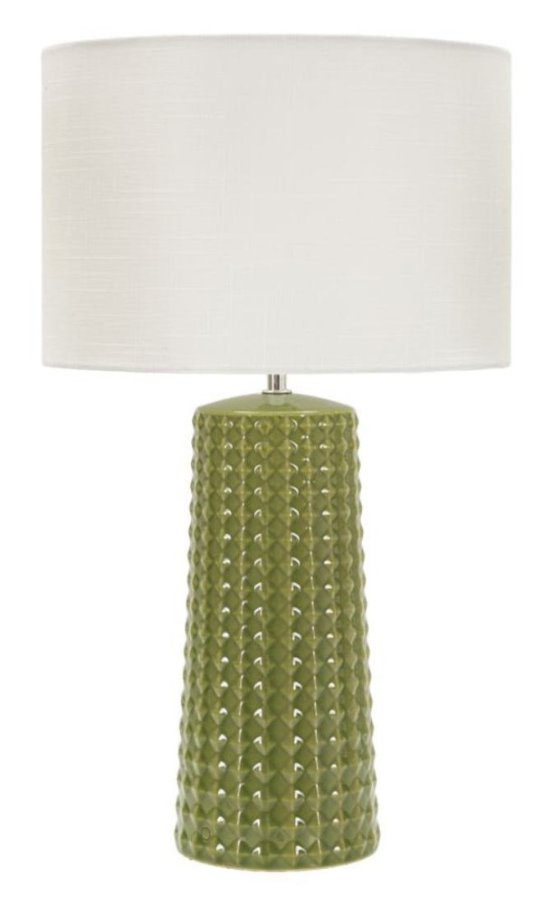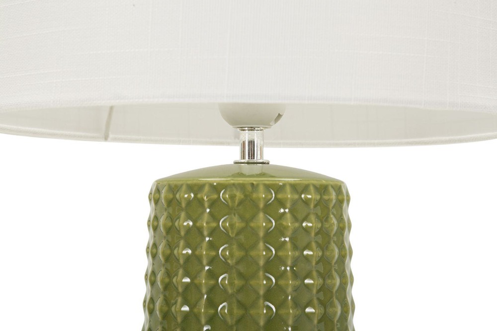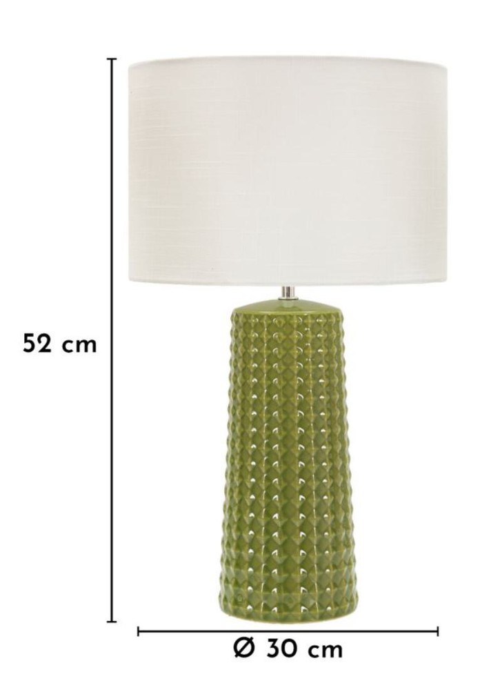 Diese Tischlampe verbindet modernes Design mit markanter Materialität und wird zum stilvollen Blickfang in jedem Raum. Der Sockel aus glänzender grüner Keramik zeichnet sich durch eine geometrische Reliefstruktur aus, die Licht und Schatten subtil einfängt und dem Design Tiefe sowie eine haptische Dimension verleiht. Die klaren Linien der Struktur kontrastieren elegant mit der sanften Rundung des Sockels und verleihen der Lampe eine skulpturale Präsenz. Der Lampenschirm aus weißem Stoff rundet das Erscheinungsbild harmonisch ab und sorgt für ein weiches, gleichmäßiges Licht, das eine warme und einladende Atmosphäre schafft. Die Kombination aus glänzender Oberfläche, strukturiertem Relief und neutralem Schirm macht die Lampe zu einem dekorativen Element, das moderne Wohnräume ebenso bereichert wie klassisch eingerichtete Bereiche. Mit den Maßen von ca. 30 x 52 x 30 cm (Breite x Höhe x Tiefe) ist die Lampe groß genug, um als Statement-Stück zu wirken, ohne den Raum zu dominieren. Sie vereint ästhetisches Design, hochwertige Keramikverarbeitung und stimmungsvolles Licht und setzt überall dort, wo sie platziert wird, ein elegantes Highlight.