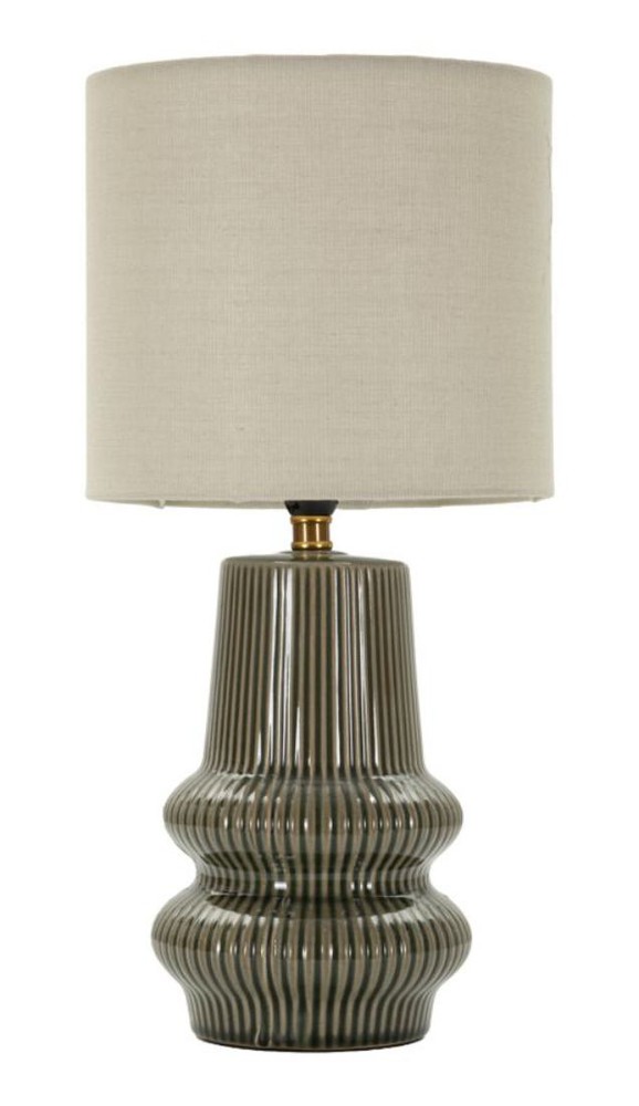 Diese Tischlampe vereint elegantes Design mit hochwertiger Handwerkskunst und wird zu einem stilvollen Blickfang in jedem Raum. Der Sockel aus Keramik in sattem Grün zeichnet sich durch eine organische, geschwungene Form aus, die von senkrechten Rillen durchzogen ist und dem Stück Tiefe und Struktur verleiht. Ein goldfarbenes Detail an der Oberseite setzt einen edlen Akzent und unterstreicht die raffinierte Gestaltung. Der Lampenschirm aus beigem Stoff rundet das Design harmonisch ab und sorgt für ein weiches, angenehmes Licht, das eine gemütliche Atmosphäre schafft. Die Kombination aus der natürlichen Form des Sockels, der strukturierten Oberfläche und dem goldfarbenen Highlight macht die Lampe zu einem dekorativen Statement, das Stil und Funktionalität perfekt verbindet. Mit den kompakten Maßen von ca. 20 x 41,5 x 20 cm (Breite x Höhe x Tiefe) lässt sich die Lampe flexibel einsetzen, ohne den Raum zu dominieren. Sie bietet stimmungsvolles Licht und ein ansprechendes Design, das modernen und klassischen Einrichtungsstilen gleichermaßen eine elegante Note verleiht.