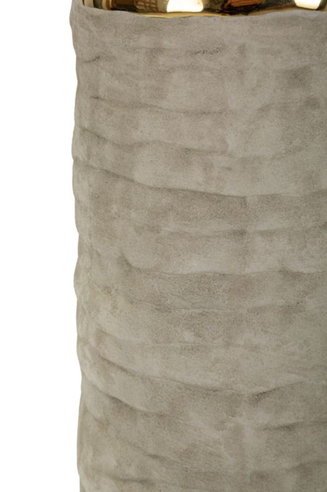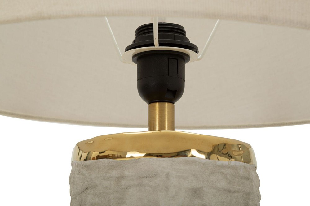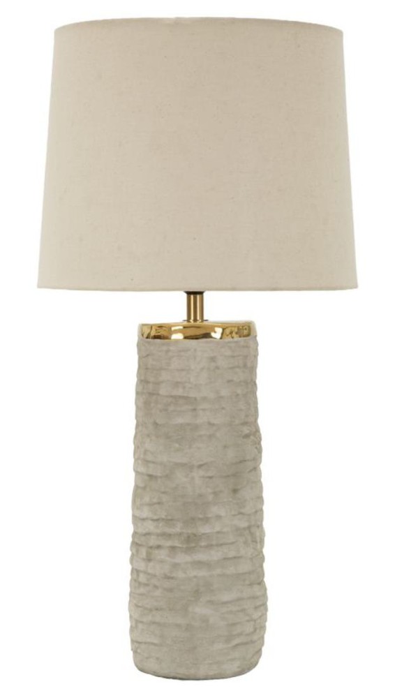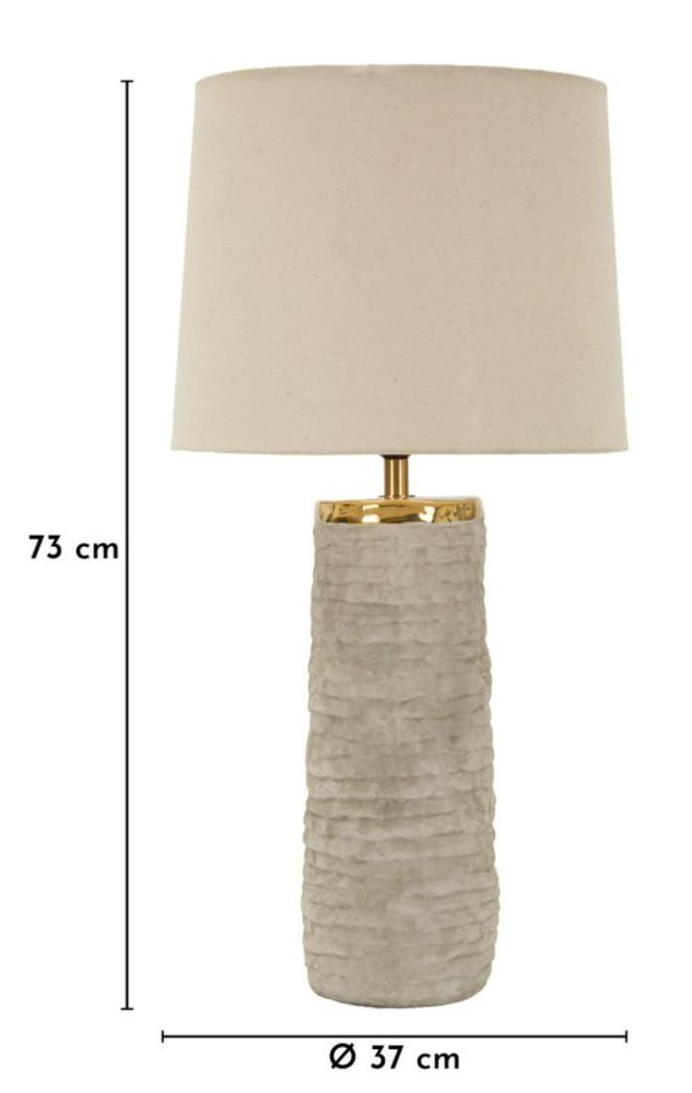 Diese stilvolle Tischlampe vereint elegante Materialien mit einem modernen, zeitlosen Design und setzt geschmackvolle Akzente in Ihrem Wohnraum. Der Sockel aus grauer Keramik mit strukturierter Oberfläche verleiht der Lampe eine besondere Tiefe und sorgt für eine edle, hochwertige Ausstrahlung. Ein goldfarbenes Detail aus Metall oberhalb des Sockels setzt einen eleganten Kontrast und unterstreicht den stilvollen Charakter der Leuchte. Der Lampenschirm aus beigefarbenem Stoff rundet das Gesamtbild harmonisch ab und sorgt für ein angenehmes, warmes Licht, das eine gemütliche und zugleich elegante Atmosphäre schafft. Die Kombination aus neutralen Farbtönen und klaren, essentiellen Linien macht diese Tischlampe zu einem vielseitigen Wohnaccessoire, das sich mühelos in unterschiedliche Einrichtungsstile integrieren lässt. Mit einer Größe von ca. 37 x 73 x 37 cm (Breite x Höhe x Tiefe) wird diese Tischlampe zu einem dekorativen Blickfang, der Ihrem Zuhause eine helle, elegante und moderne Atmosphäre verleiht.