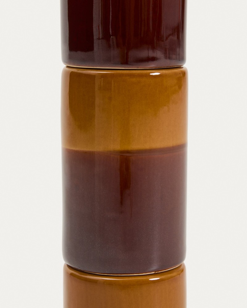 Setzen Sie stilvolle Akzente in Ihrem Zuhause mit dieser eleganten Tischlampe, die modernes Design mit natürlichen Materialien perfekt verbindet. Der Sockel aus glasierter Keramik präsentiert sich in einer harmonischen Kombination aus Senfgelb und Braun und verleiht der Lampe eine warme, lebendige Ausstrahlung. Die glänzende Oberfläche reflektiert das Licht dezent und macht den Lampensockel zu einem dekorativen Blickfang auf Ihrem Tisch, Sideboard oder Nachttisch. Der Lampenschirm aus hochwertiger weißer Baumwolle sorgt für ein weiches, gleichmäßiges Licht, das eine behagliche und einladende Atmosphäre schafft. Die neigbare Funktion der Lampe ermöglicht Ihnen, den Lichtkegel individuell auszurichten – perfekt für gemütliche Leseecken, stimmungsvolle Akzente im Wohnzimmer oder als elegante Beleuchtung auf dem Nachttisch. Besonders hochwertige Details wie das mit sehr weichem Stoff ummantelte Kabel und die schwarze Rosette runden das edle Gesamtbild ab und unterstreichen die sorgfältige Verarbeitung. Das Zusammenspiel von farbiger Keramik, natürlicher Baumwolle und feinen Accessoires macht die Lampe zu einem funktionalen Designobjekt, das sowohl Licht spendet als auch Ihr Interieur stilvoll ergänzt. Mit kompakten Maßen von ca. 30 x 61,5 x 30 cm findet die Lampe überall ihren Platz, ohne aufdringlich zu wirken, und sorgt dennoch für eine auffällige, dekorative Präsenz. Sie verbindet hochwertige Materialien, durchdachte Funktionalität und zeitlose Ästhetik zu einem eleganten Wohnaccessoire, das Ihrem Raum Wärme, Charakter und ein angenehmes Licht verleiht.