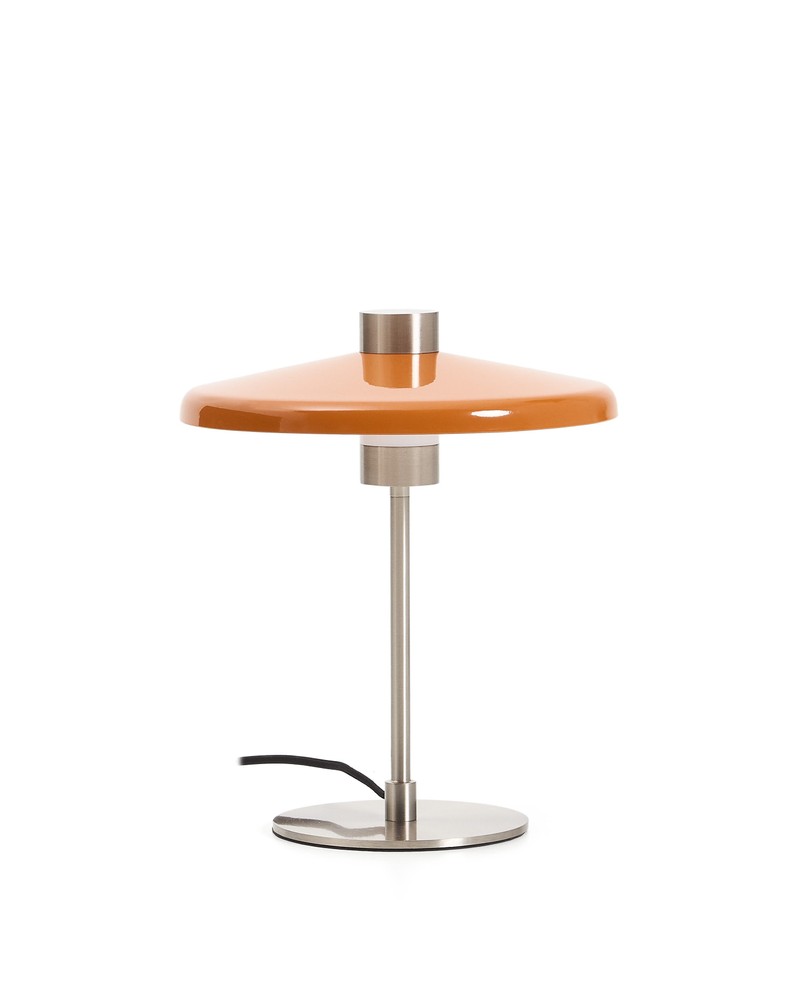 Diese elegante Tischlampe vereint modernes Design mit einem lebendigen Farbakzent und wird so zu einem stilvollen Blickfang in Ihrem Wohn- oder Arbeitsbereich. Der Lampenkörper aus gebürstetem Stahl in Silber besticht durch seine feine, strukturierte Oberfläche, die dem Licht eine dezente Reflexion verleiht und für ein hochwertiges, edles Erscheinungsbild sorgt. Der farbige Schirm in lebendigem Orange setzt einen modernen Kontrast zum silbernen Gestell und sorgt gleichzeitig für ein warmes, einladendes Licht. Ob auf dem Schreibtisch, Sideboard oder Nachttisch – die Lampe schafft eine gemütliche Atmosphäre und bringt gleichzeitig Energie und Charakter in den Raum. Besonders praktisch und angenehm ist das mit sehr weichem schwarzem Stoff ummantelte Kabel, das nicht nur stilvoll wirkt, sondern sich auch leicht handhaben lässt. Mit einer Kabellänge von 166 cm können Sie die Lampe flexibel platzieren, ohne auf Steckdosen in unmittelbarer Nähe angewiesen zu sein. Mit kompakten Maßen von ca. 27 cm Breite, 32,5 cm Höhe und 27 cm Tiefe passt die Tischlampe auch auf kleinere Flächen, ohne überladen zu wirken. Sie kombiniert stilvolles Design, hochwertige Materialien und durchdachte Funktionalität und eignet sich perfekt für alle, die modernes Ambiente und wohnliche Wärme miteinander verbinden möchten.