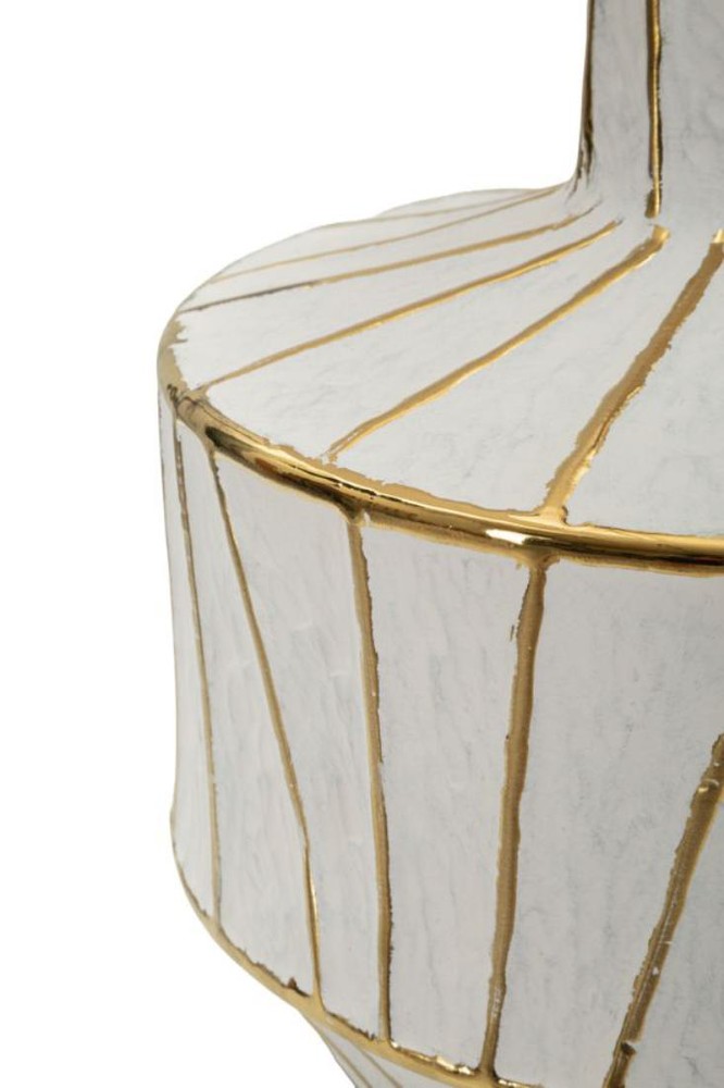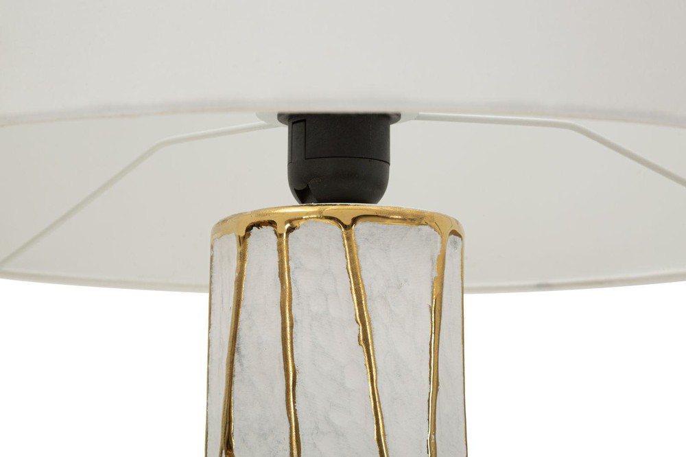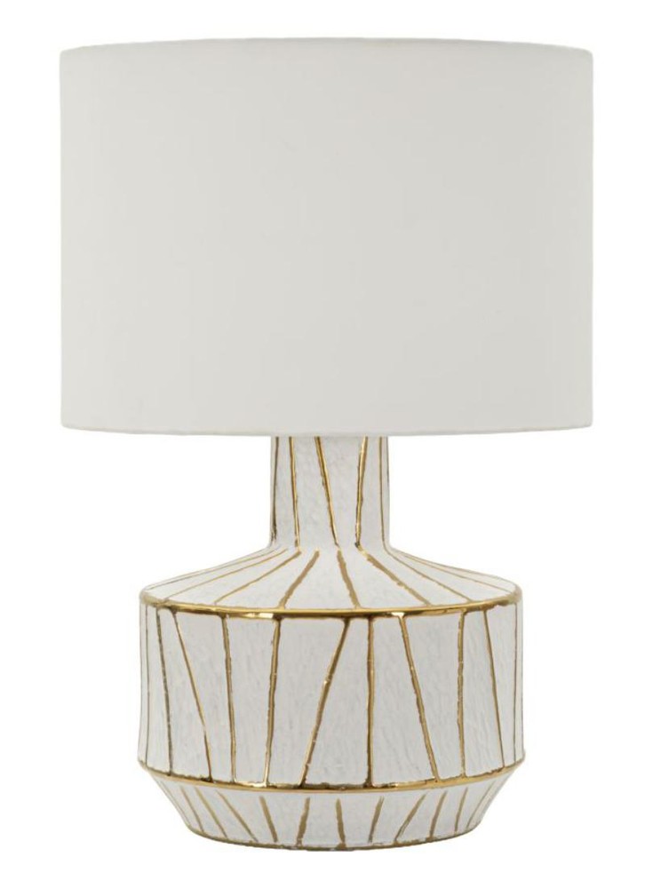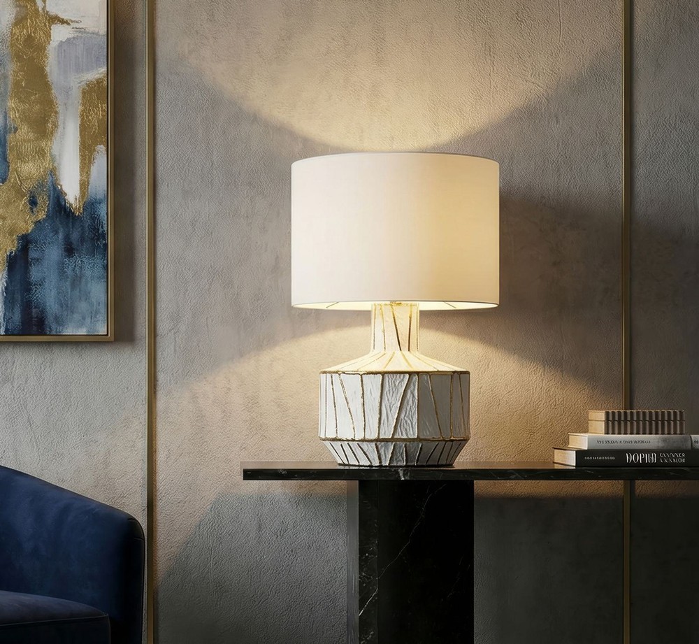 Diese elegante Tischlampe vereint modernes Design mit zeitloser Eleganz und wird zum stilvollen Highlight in jedem Raum. Der zylindrische Sockel aus weißer Keramik besticht durch eine edle Struktur: Eine unregelmäßige, goldfarbene geometrische Linienführung verleiht der Lampe Tiefe und Charakter, während das harmonische Zusammenspiel von Weiß und Gold einen luxuriösen, aber dennoch dezenten Akzent setzt. Der Lampenschirm aus weißem Stoff ergänzt den Sockel perfekt und sorgt für ein weiches, warmes Licht, das eine gemütliche und einladende Atmosphäre schafft. Die Kombination aus klarer Formensprache und dekorativen Details macht die Lampe zu einem stilvollen Accessoire für Wohnzimmer, Schlafzimmer oder Arbeitszimmer. Mit einer Höhe von ca. 60 cm und einer Breite sowie Tiefe von je ca. 40 cm ist sie sowohl ein markanter Blickfang auf Sideboards, Konsolen oder Nachttischen, als auch ein funktionales Lichtobjekt. Der zylindrische Sockel mit seinem goldfarbenen geometrischen Muster zieht dabei sofort alle Blicke auf sich und verleiht jedem Raum einen Hauch von moderner Eleganz.