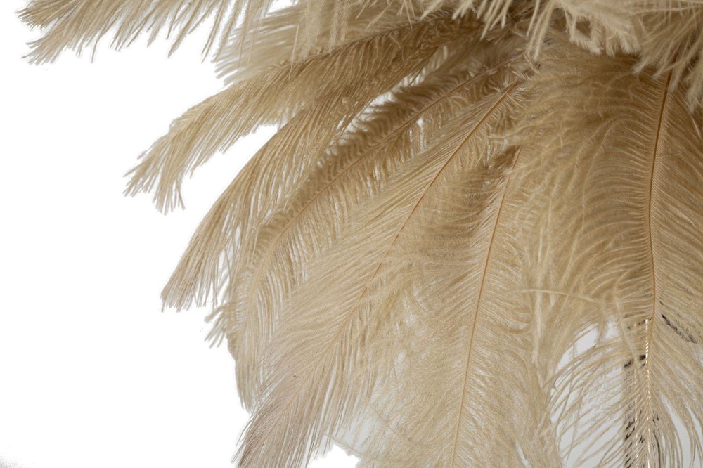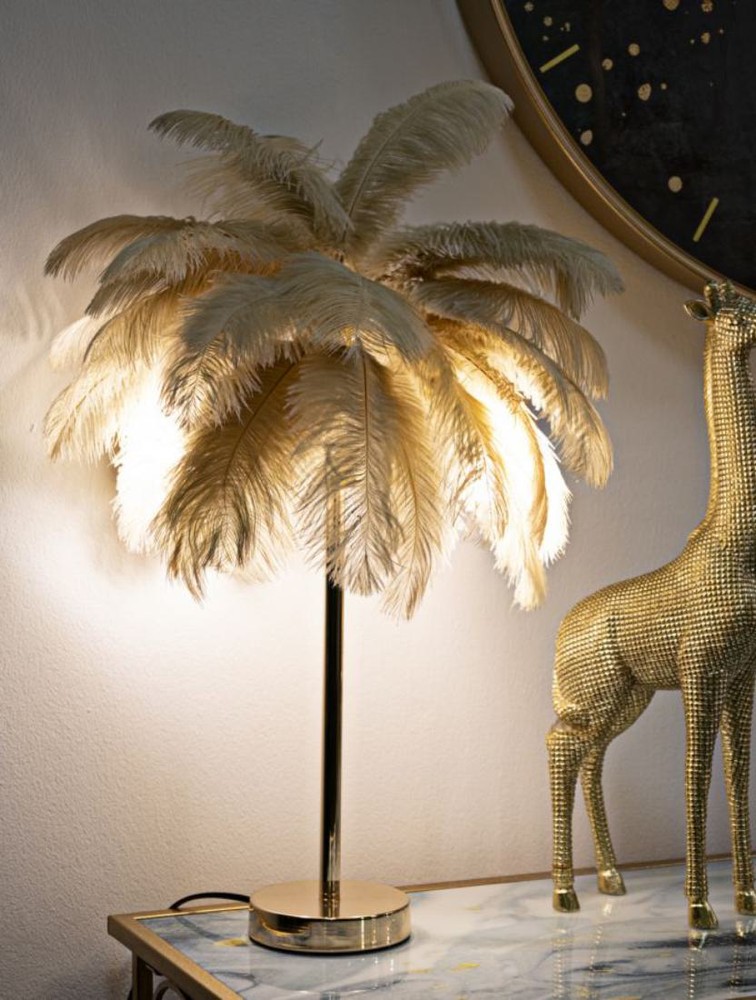 Die edle Tischlampe verbindet einen goldfarbenen Metallfuß mit einem opulenten Schirm aus beigen Federn. Das schimmernde Metallgestell verleiht dem Design eine luxuriöse Eleganz, während die flauschigen Federn das Licht sanft streuen. So entsteht ein warmes, diffuses Leuchten, das jeden Raum mit einer romantischen Atmosphäre erfüllt. Starke Kontraste aus glänzendem Gold und zartem Beige sorgen für ein glamouröses Highlight in jedem Einrichtungsstil.